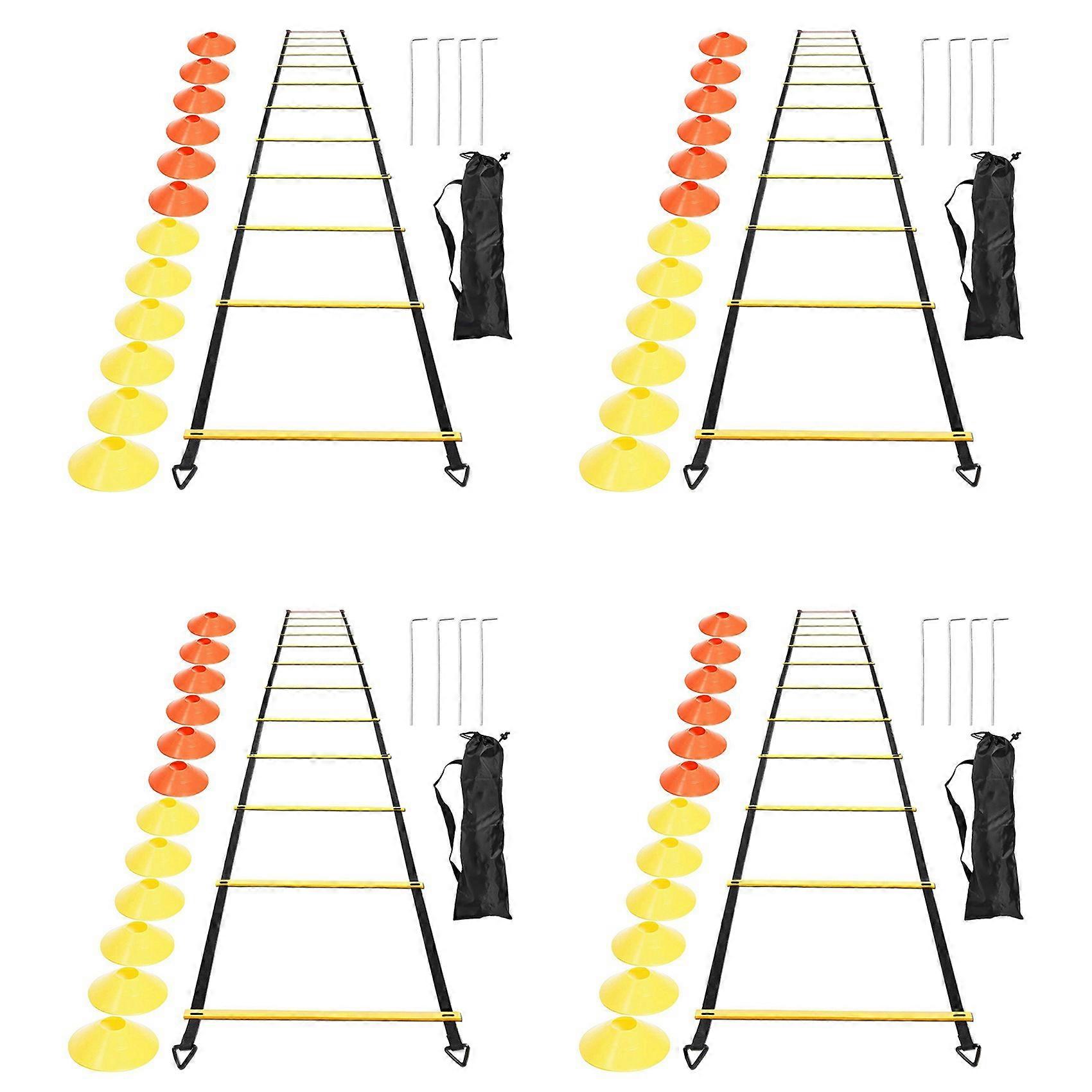 [Adjustable cross design with scale] The webbing has a sturdy jacquard scale, and the width of the designated cross belt can be adjusted according to different exercises and groups (adults/children). It can be easily and simply adjusted to the desired width of the banner. The maximum distance between them can be adjusted to 19 inches [12 gears and 19.7 feet] The agility ladder is equipped with 12 durable plastic pedals with a total length of 19.7 feet. At the same time, the head is equipped with a triangular connection buckle, which can be fixed on the lawn with a ground anchor to avoid running. [Quality] Durable and agile ladder guide rail: 0.2 cm thick high-strength Plastic material. In addition, high-quality nylon webbing and soft cones form a professional ladder suit to enhance your training effect. The agile ladder is durable and suitable for all seasons. [Easy to carry] This agility ladder can be used in the home gym or on the grass to maximize your training level and surpass the competition. After completing the training, you can put the whole set of items in the storage bag. [Perfect tool for exercise] Agility ladder is the main tool for footwork practice. It is very helpful for many sports that require fast movement, such as basketball, football, softball, volleyball, tennis, free fighting, boxing, etc. The agility ladder can improve the ability to move quickly, enhance the flexibility, balance and coordination of the body. colour: black + yellow + orange Material: Plastic+Nylon Size: 55x15x5CM Package Contents: 48 x logo discs 16 x ground spikes 4 x agility ladder 4 x storage bag