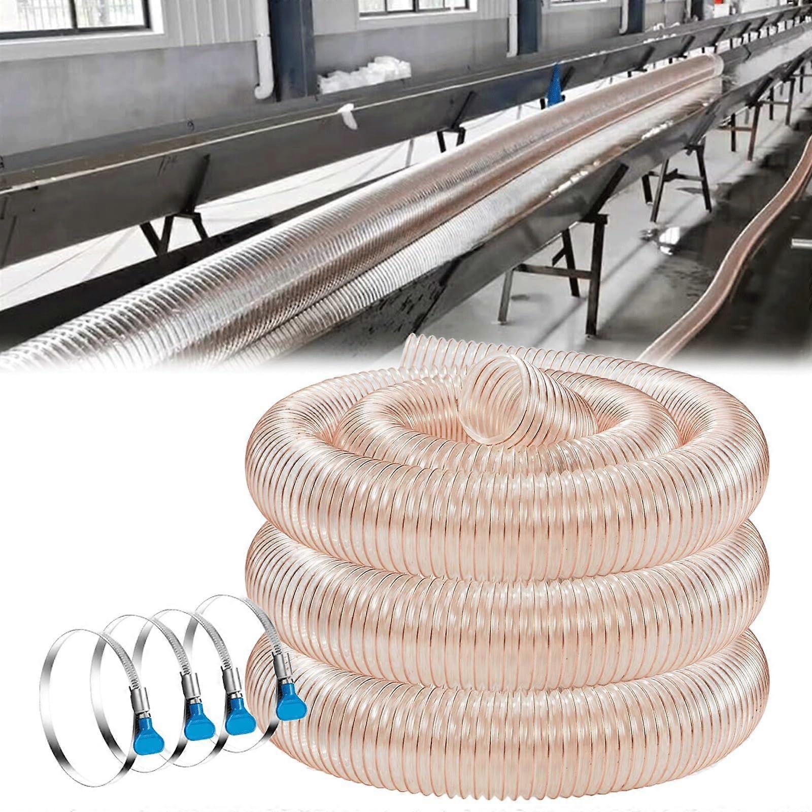 Vac Clear Pipe Dust Collection Hose Wide Size Selection: Available in 600 size combinations (60 inner diameter options and 10 length options) so you can select the exact fit for your dust collection system and workspace needs. Durable Construction: Made from quality PU (polyurethane) reinforced with copperplated spring steel wire. This combination offers exceptional flexibility, strength, and resistance to tearing, even under heavy and frequent use. Static Discharge Capability: When both ends of the hose are properly grounded, static electricity is safely discharged, enhancing user safety and maintaining performance in dust collection systems. HeavyDuty Performance: Copperplated steel wire reinforcement provides puncture resistance, withstanding abrasive dust and sharp debris from woodworking operations such as cutting, milling, and sanding. It effectively contains fine sawdust without leaks. Clear Material for Visual Monitoring: Transparent PU material lets you easily see dust flow during use, detect buildup or clogs quickly, and address issues before they impact system performance. Easy Installation: Flexible and tough design allows straightforward connection to dust collection fittings and vac systems, making setup fast and secure. Ideal Applications: 1. Woodworking shops for collecting sawdust, wood chips, and fine sanding dust. 2. Industrial workstations where abrasive debris and static buildup need controlled handling. 3. DIY home workshops requiring a clear, durable, and adaptable hose for vacs or dust extraction units. This clear PU copperplated steel wire dust collection hose is designed for demanding environments, offering reliable dust containment, long service life, and easy visual inspection for maintenance. Its versatility and quality materials ensure results for professional and hobbyist use alike.