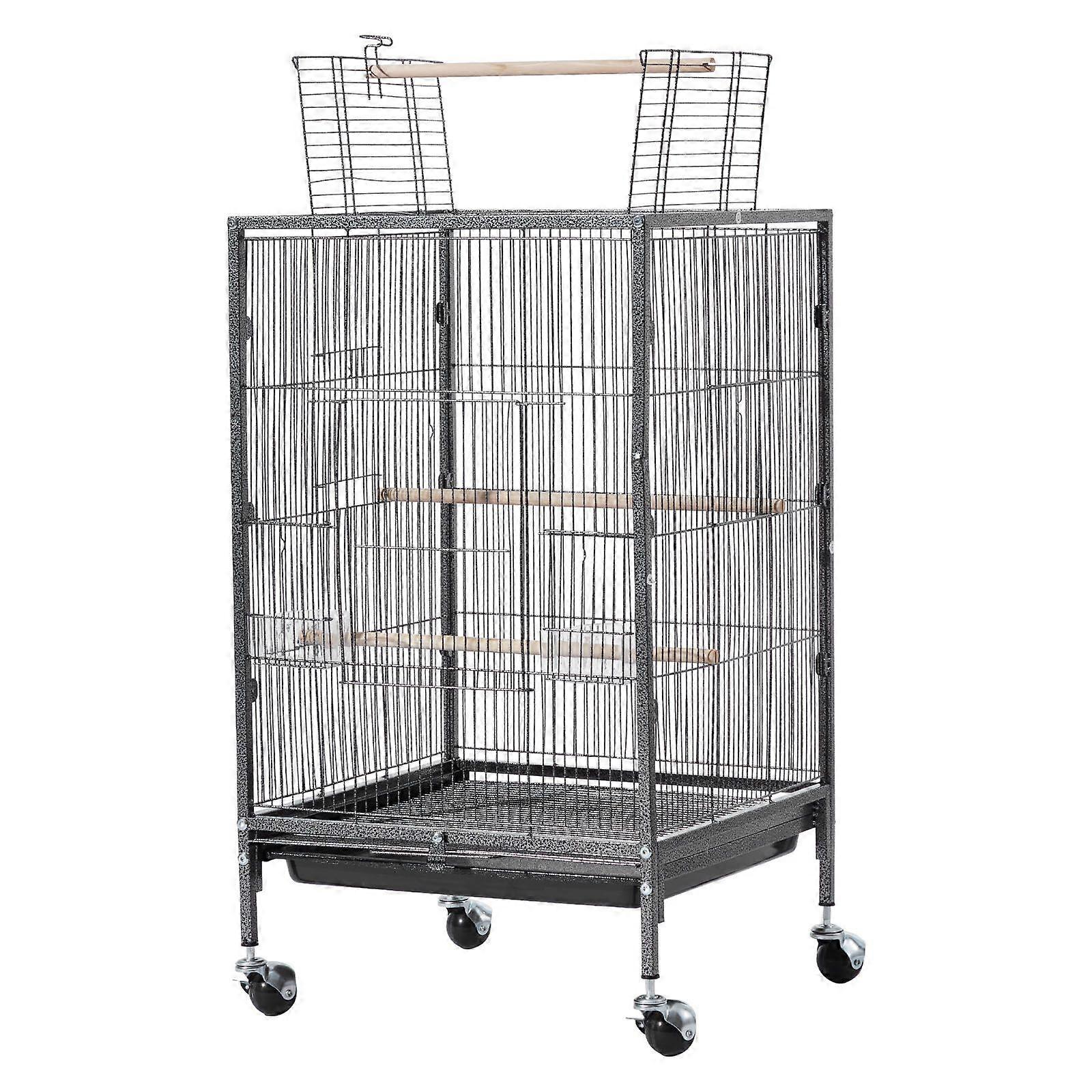 Bird Cage, 460 x 460 x 770 mm, Open Flat Top, Wrought Iron Bird Flight Cage with Perches, Slide-Out Tray and Plastic Feeders