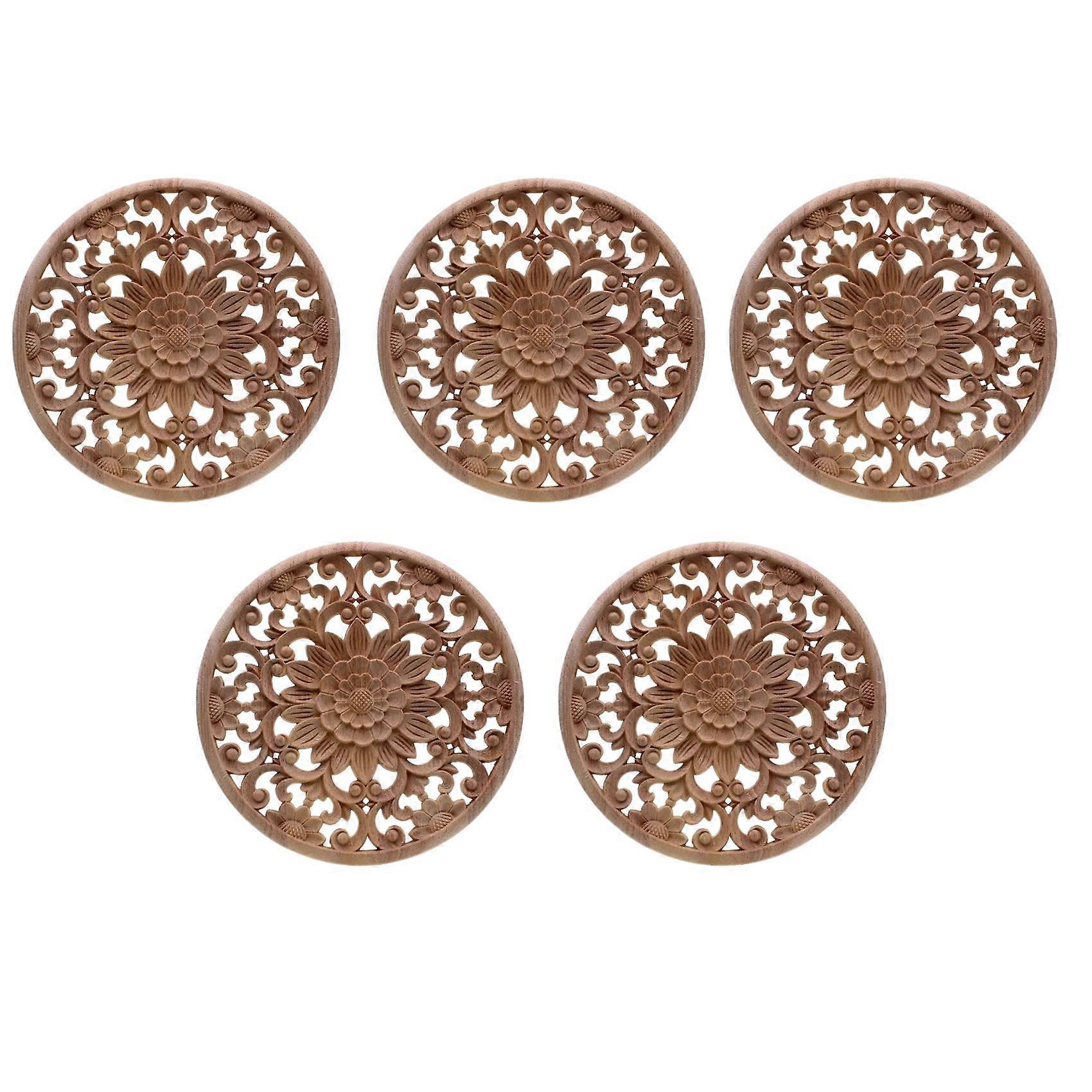 5X Carved Flower Carving Round Wood Appliques for Furniture Cabinet Unpainted Wooden Mouldings Decal 15x15x0.8cm