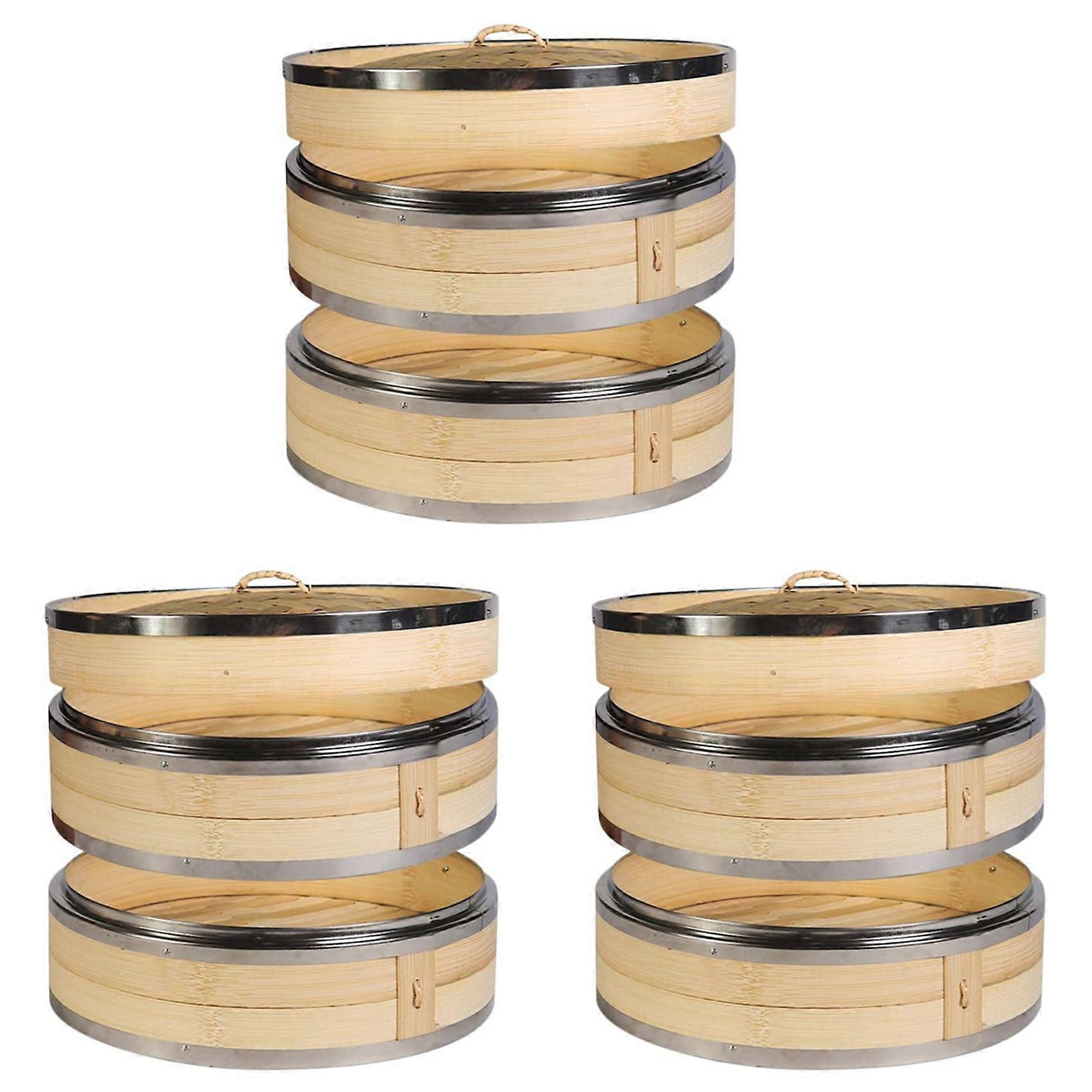 3X 2 Tier Kitchen Bamboo Steamer with Double Stainless Steel Banding for Asian Cooking Buns Dumplings Fish Rice