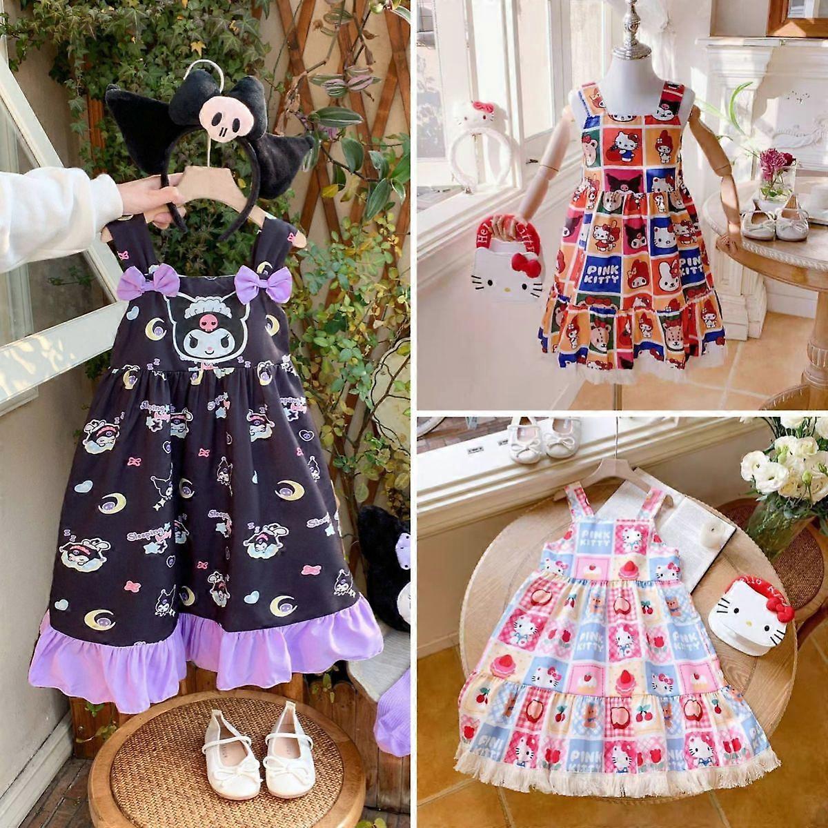 Sanrio Girl Kuromi Kawaii Princess Dress Summer Cartoon Anime Floral Print mid Length Skirt Suspender Dress for Kids