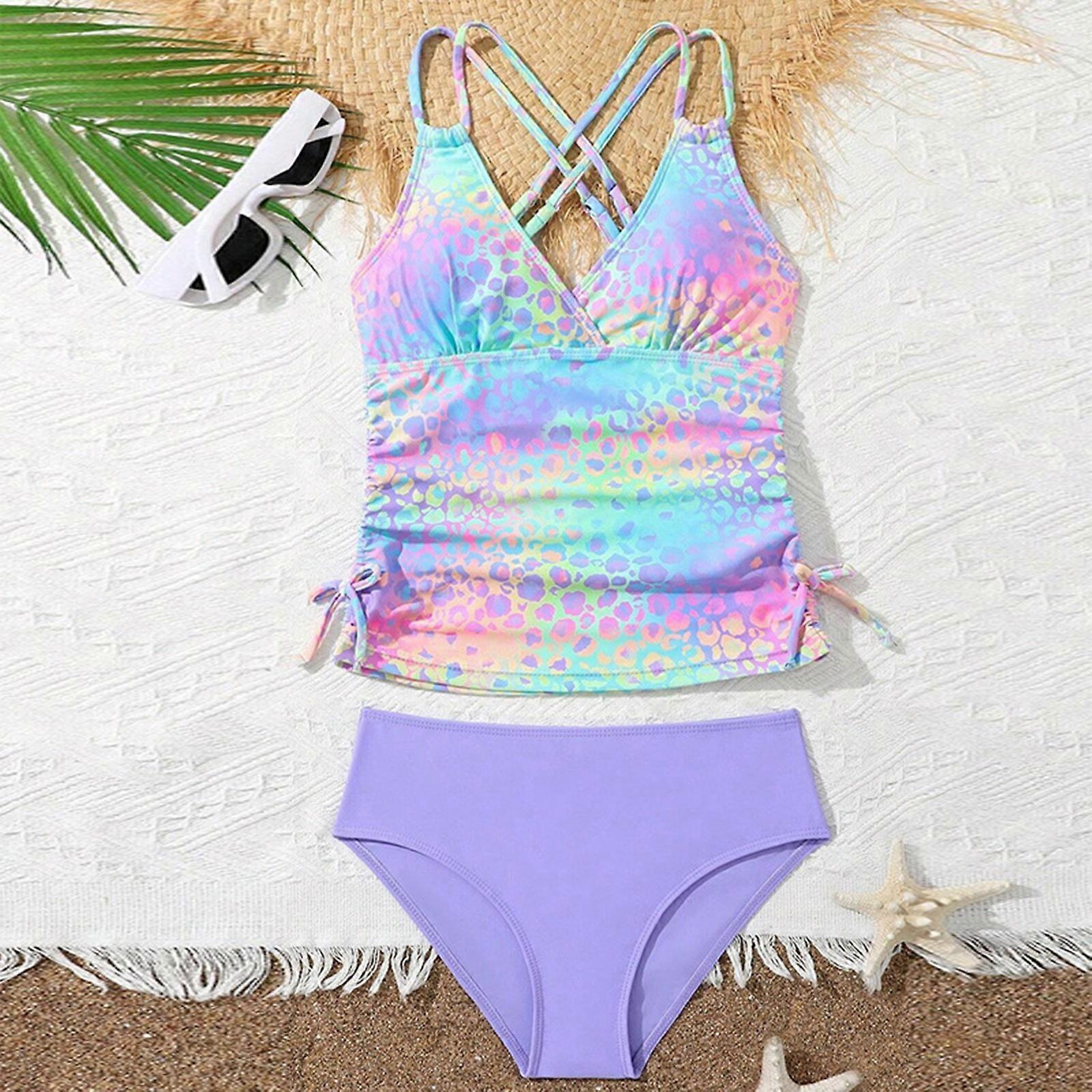 Girl'S Two Piece Set New Separate Tankini Swimsuit Leopard Ruched Strappy Bathing Suit Toddler Guard Girl Summer Vacation Suits