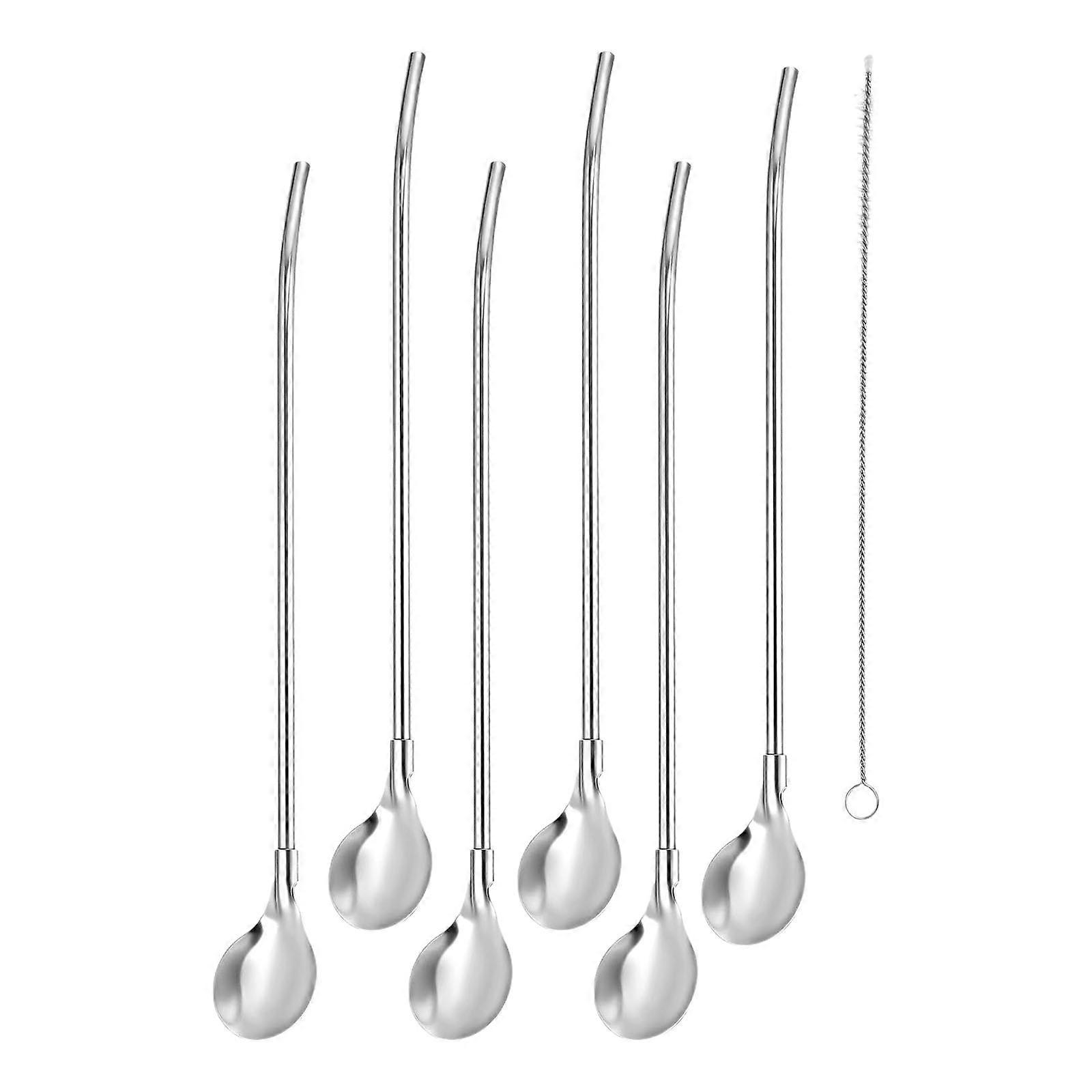 6Pcs Long Handle Straw Spoon with Cleaning Brush Stainless steels Straw Cocktail Stirring Spoon for Iced Teas Milkshakes Multicolor