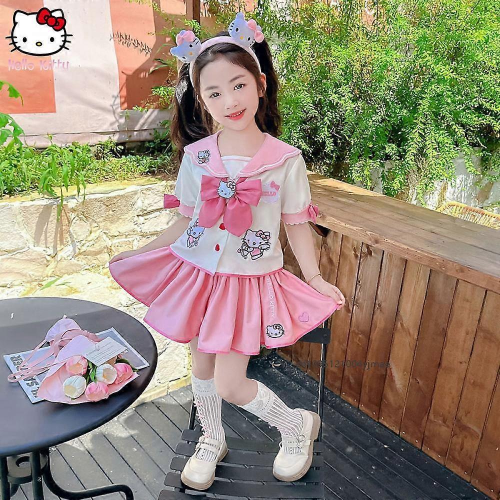 Kawaii Hello Kitty Girls Jk Skirt Set Sanrios Anime Cinnamoroll Summer Bow Doll Collar Short Sleeve Pleated Skirt Sailor Uniform
