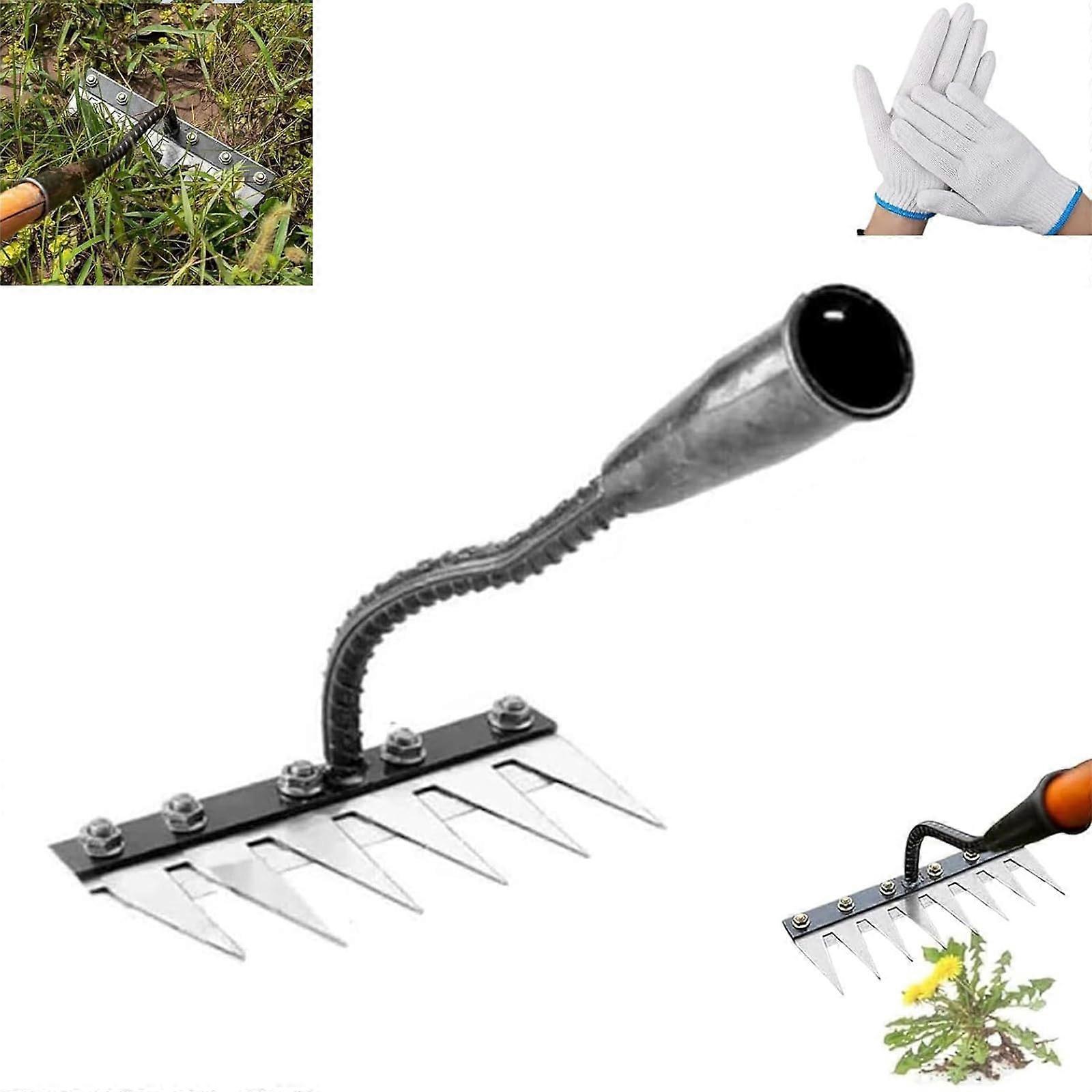 Garden Weeding Rake with 6 Tines, Carbon Steel Handheld Weeder Tool with Ergonomic Grip