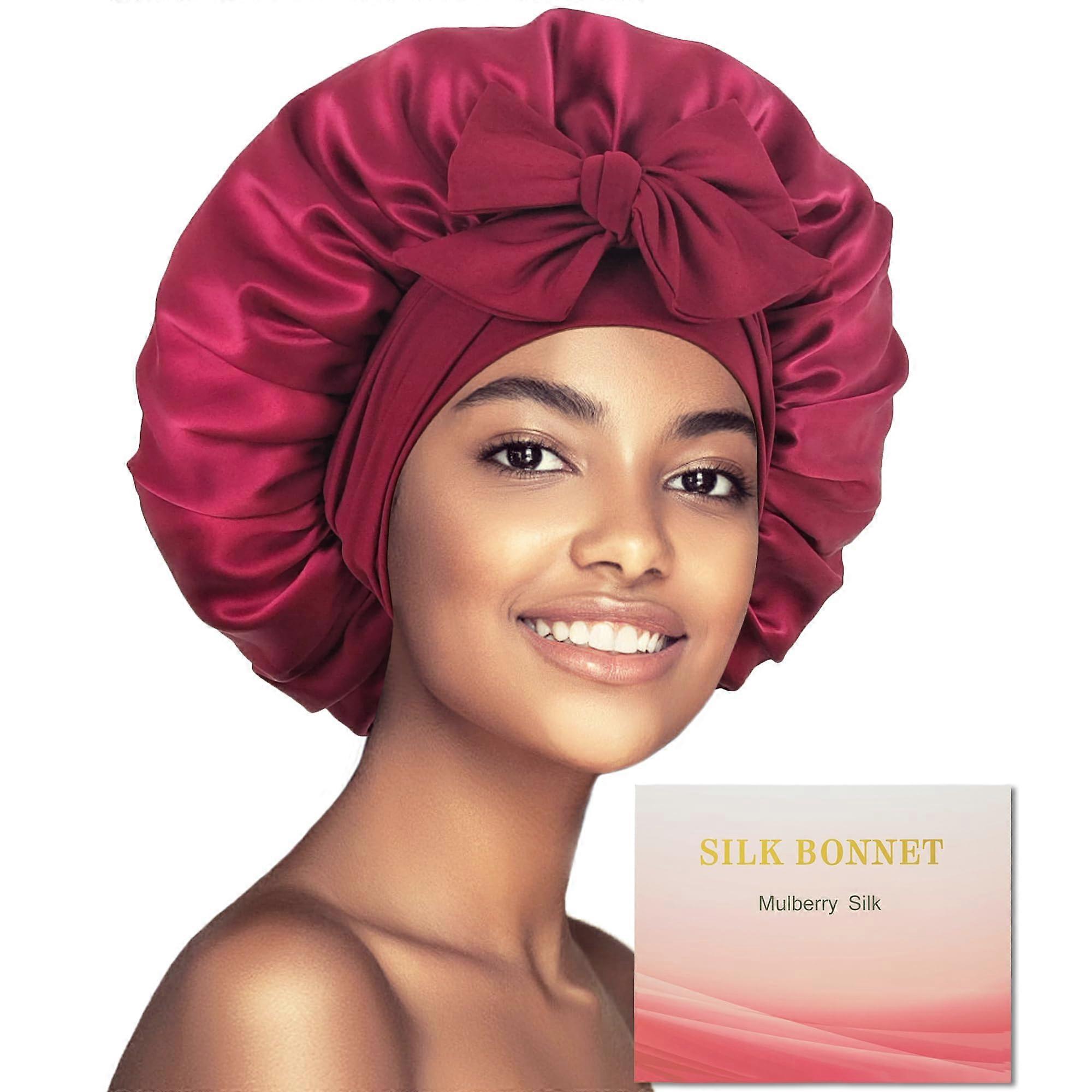 100% Mulberry Silk Sleep Bonnet for Women Curly Hair, Double Layer Frizz Reduction Cap with Adjustable Tie Band