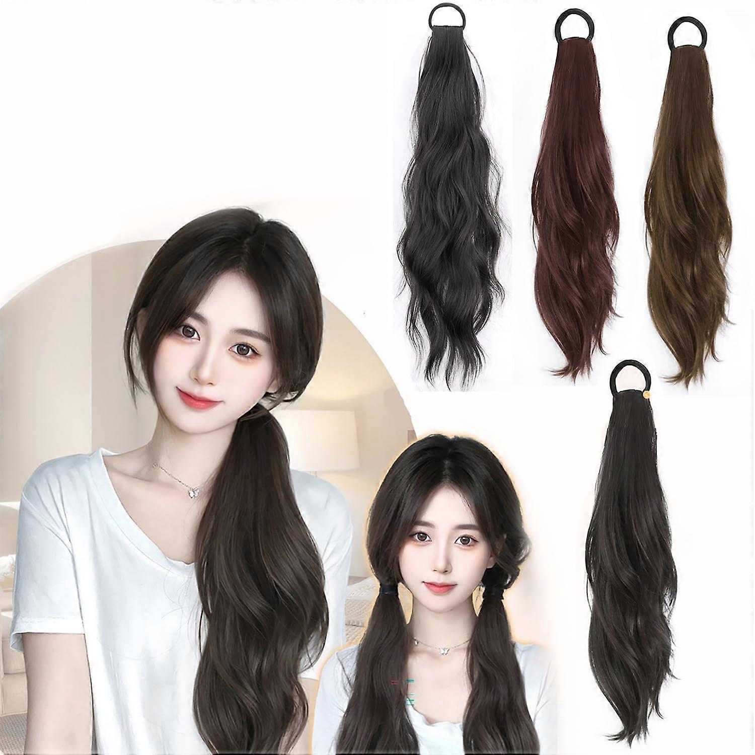 Ponytail Hair Extensions Clip In Dark Brown Wavy Heat Resistant Synthetic 2pcs Dual Set