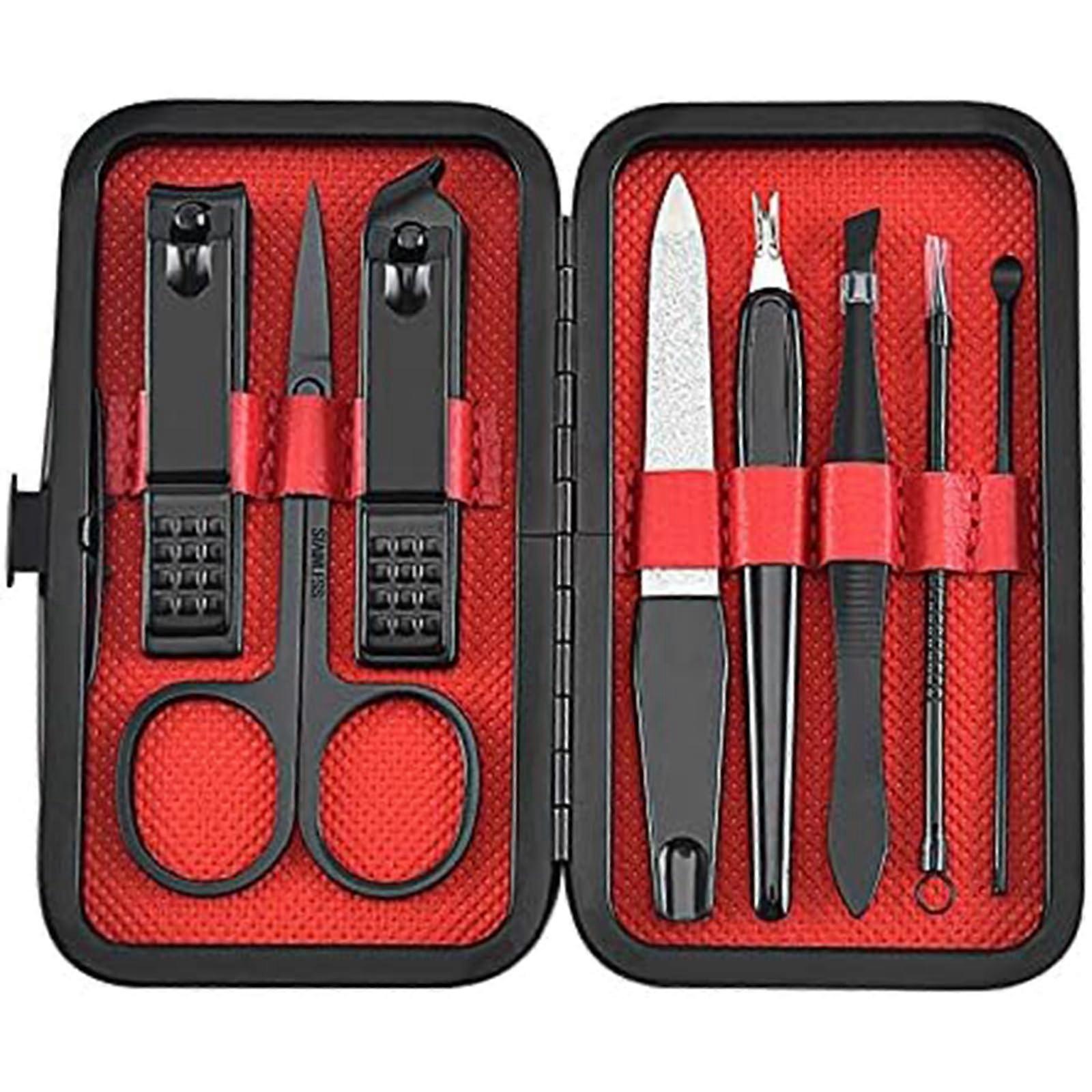 8pcs Gray version of the 7/8/9pcs Nail Manicure and Pedicure Set. Compact, multifunctional stainless steel kit designed for adult and elderly nail care. The set is supplied in a portable PU leather case for tidy storage and easy transport. Key benefits Durable stainless steel construction: hard, sharp, and long lasting for reliable trimming and shaping. Compact and portable: 10.8 x 6 x 2.2 cm (4.25 x 2.36 x 0.86 inches) and 111 g, fits in a bag or drawer for travel or home use. Ergonomic handling: mediumsize clippers and comfortable grips make trimming easier and reduce hand fatigue. Complete grooming set: includes tools for hand, foot, and facial care in one kit, avoiding separate purchases. What is included Nail clippers Nail files Tweezers Ear picks Nail scissors Acne needles Portable PU leather case Product features Multifunctional tools suitable for manicure and pedicure tasks. Corrosionresistant stainless steel for consistent performance. Sharp edges and sturdy blades handle hard or thick nails with less effort. Portable case protects tools from scratches and helps keep everything organized. Practical uses Home grooming: Maintain nails for daily appearance and comfort with a single organized kit. Travel and commuting: Compact case stores neatly in luggage or a toiletry bag for onthego touch ups. Care for elderly or those with thicker nails: Sturdy stainless steel tools provide the control needed for precise trimming. Notes This listing is for the manicure set only; other items shown are not included. Size and weight are measured manually; slight variations may occur. Color may vary slightly due to lighting and screen differences. Choose this 8pcs Gray manicure and pedicure set for a portable, professionalfeeling toolkit that covers common grooming needs.