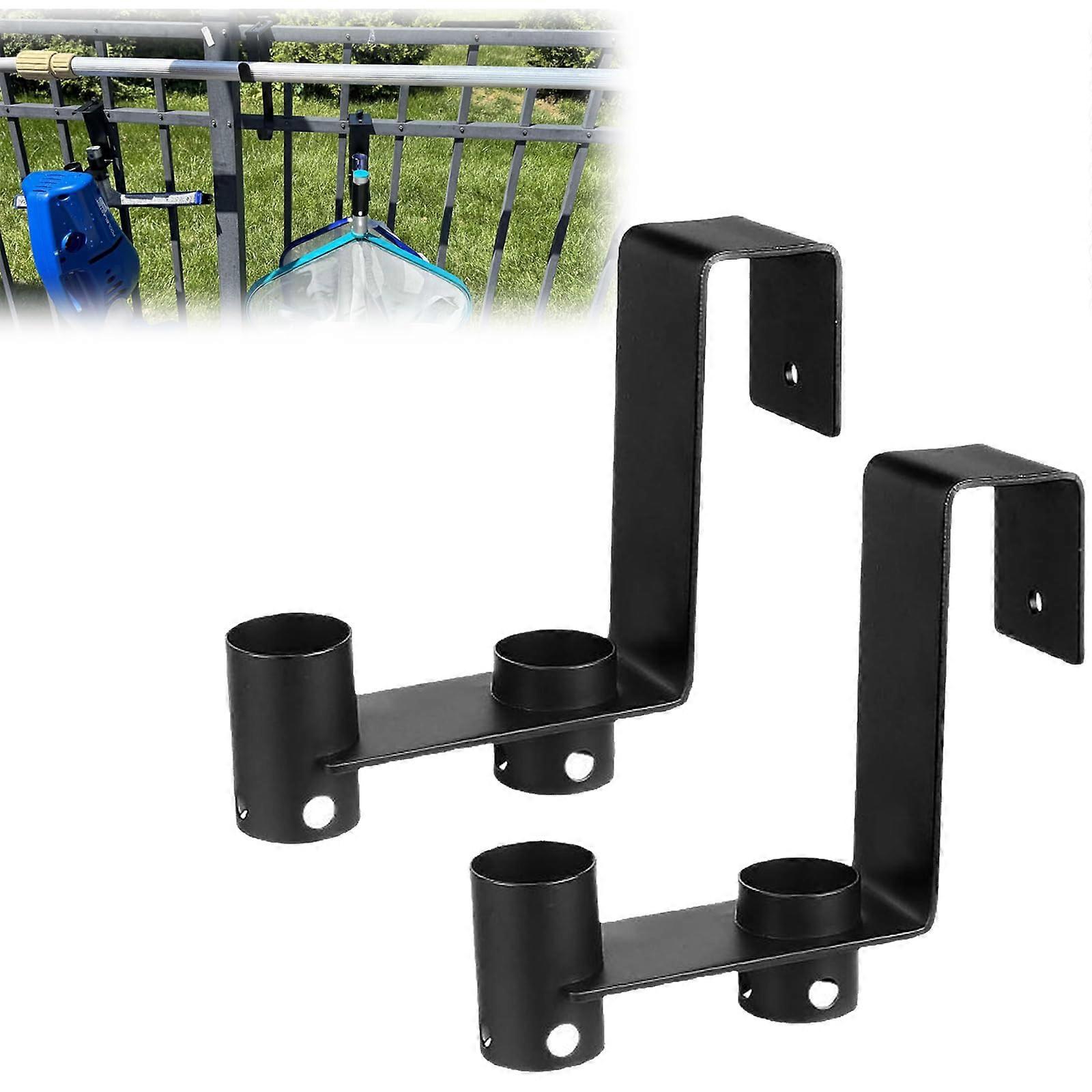 2 POOL FENCE HOOKS SET Includes 2 pool fence hooks designed to hang pool equipment conveniently. They can hold pool skimmer poles, skimmer nets, brushes, vacuum hoses, and other pool supplies, helping keep the pool area neat and organized. materials: made of durable metal with a corrosion resistant powder coating surface. Rust for outdoor use, built for long term use. Each hook is capable of supporting up to 40 pounds. Easy to install: no screws required. Simply hang on a railing up to 1.35 inches wide. The bracket diameter is 1.2 inches, making it compatible with most standard sized cleaning accessory heads. Easy to use: The hooks are adjustable to fit different fence sizes, so you can place pool pole holders on the fence or railing and organize your cleaning tools. Use scenarios: On a pool fence or deck railing to store long tools like pole poles, nets, and brushes between uses. On poolside railing to organize hoses, nets, and other cleaning accessories, keeping them off the ground. On a balcony or fence near the pool equipment area to maintain an accessible, organized storage spot.