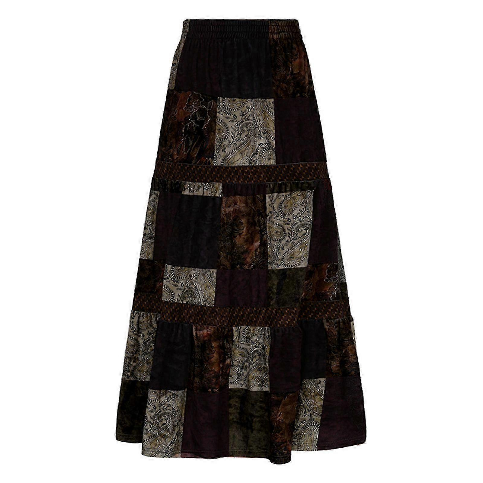 Women Velvet High Waist Pleated Boho Paisley Colorblock Plaid A-Line Long Skirt Brown L