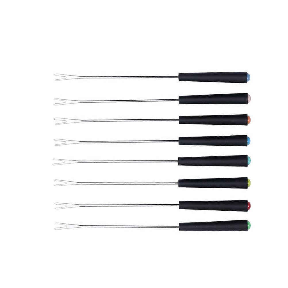 The item is a set of 8pcs handle stainless steel fondue forks. With it, you can make your own cheese fondue, chocolate fountain at home as well as dipping strawberries and chocolate. They are sturdy enough without worrying your food falling off. Great for picnic and camping. Features - Color: Black, Random Color Handle Bottom. - Material: Stainless Steel and . - Size: About 23x1.3x1cm - handle, won’t burn your handle while using. - Handy fork for cheese, fondue, barbecue. - Widely used on fruit, dessert, hot pot and more. - Made of material for lasting use. - for picnic and camping and other occasions. Package list: 8 x fork