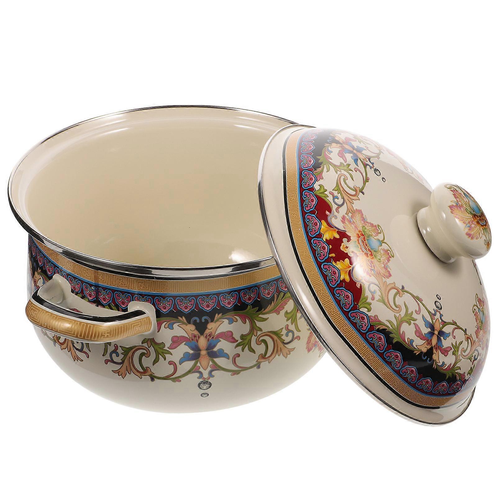 NOTE:This product is not suitable for children. Description Enamel Cooking Pot is made of high-class enamel materials, ensuring the heat it thoroughly and evenly distributed. We are so sure you are going to love the stock pot provided by us. With the lid design, it is very easy for you to use. Easy to clean, easy to store when not in use. The two-handle design makes it comfortable to hold and hold. Features - -Material:Enamel - Size: 22.00X22.00X12.00cm/8.65X8.65X4.72in -Cooking Pot with lid can be used as a pot for stew, soup, casserole and other recipes. -High temperature resistant, for a use, the enamel stockpot is a heavy-duty and practical pot. -It can not only improve the taste of the food, but also can beautify your kitchen. -The Soup Pot is fast heating of cooking food, energy saving, and slows heat dissipation. -The even heat make foods and stay warm longer, which can be used on electric stove, induction cooker, gas stove. Package list: 1 × Enamel Stockpot with Lid