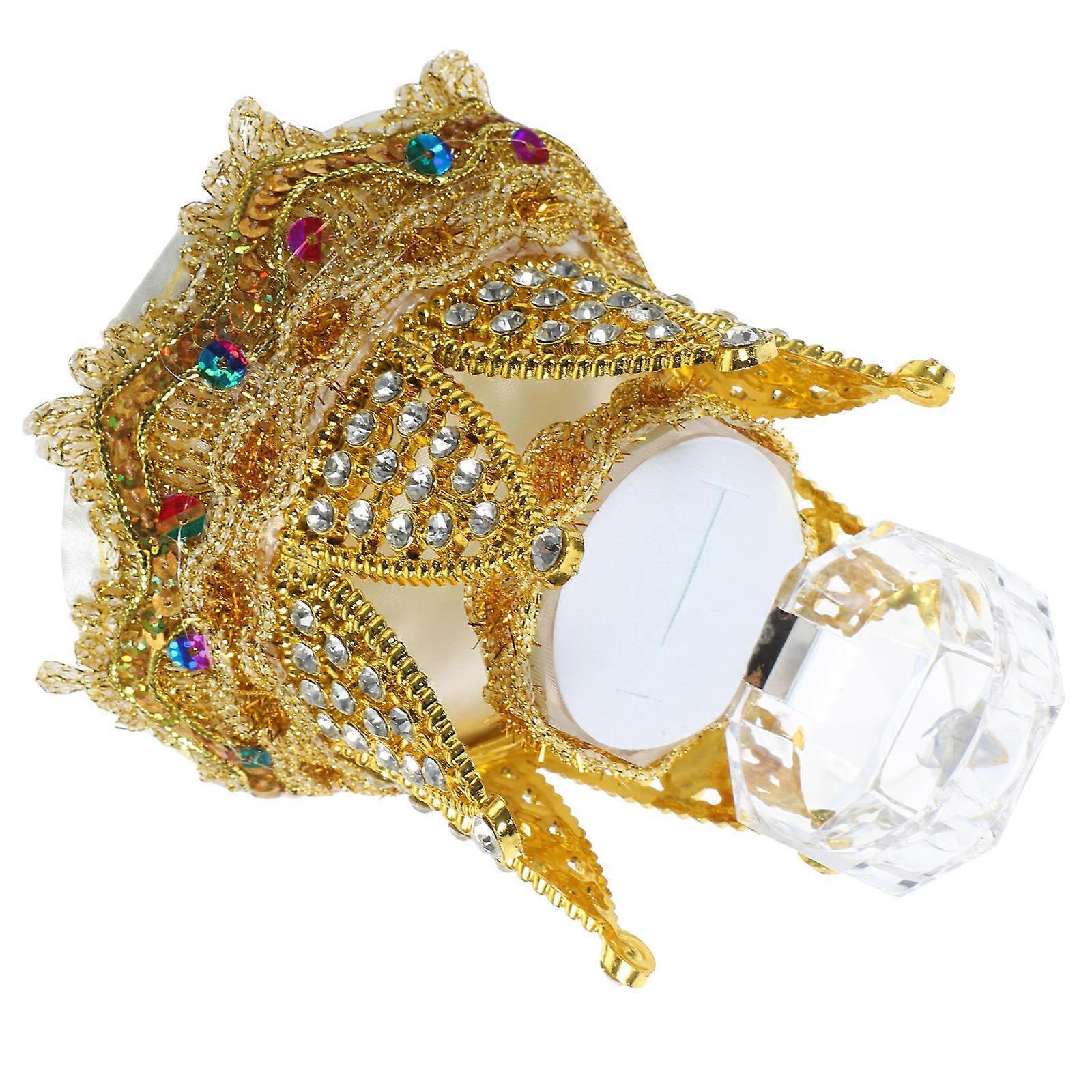 Looking for a unique ring box for your wedding? This ring box is in shape of crown, it is a good choice for you. Simple color, unique crown shape makes this ring case have better decorative effect, can also be used for display. Not only can keep your ring safe, but also can be a good and unique decoration on the table. Use this wedding ring box to decorate your desktop, or send to your family, friends. Features -Color:Golden -Material:PU, silk -Size:10.00X10.00X9.00cm/3.93X3.93X3.54in -The charm of this ring box is elevated by the addition of a crown design, adding a touch of classical elegance. -A design that adds opulence and sophistication, featuring a luxurious and elegant finish. -A practical and secure storage solution for organizing and protecting multiple rings. -Crafted with durability in mind, this ring box is resistant to deformation and built to withstand the test of time. -The texture and good finish of this ring box is achieved through meticulous polishing and treatment, ensuring a luxurious and refined appearance. Package list: 1 box