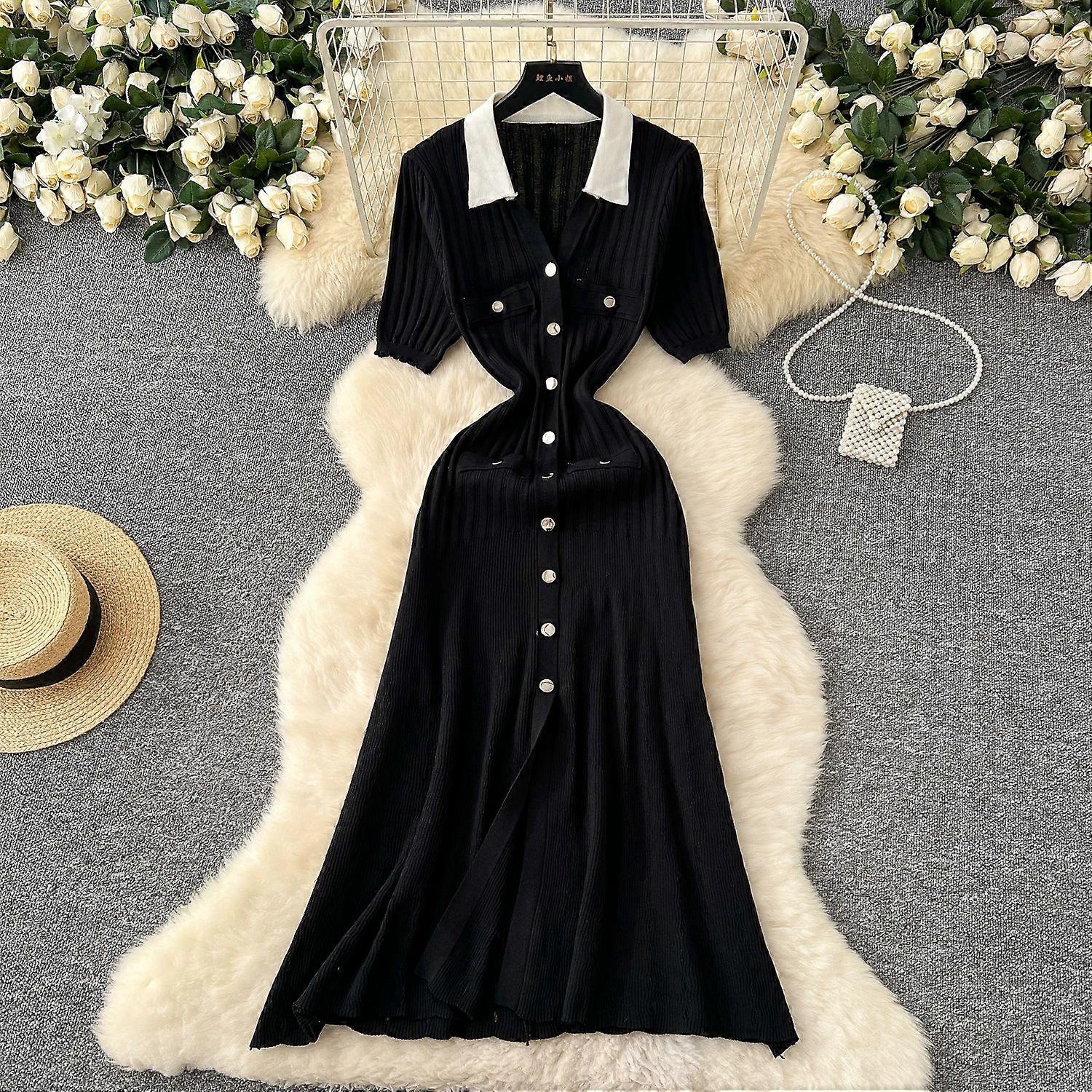Chanel Style Vintage Contrast Lapel Short-Sleeved Single-Breasted Tight Waist Inner Sweater Dress Women's Knitted Long Dress