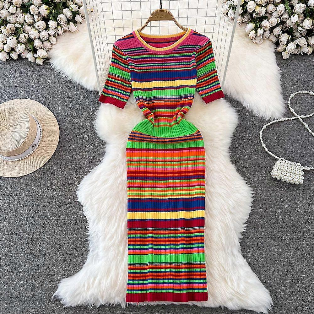 Xiaoxianfeng's Elegant Short-Sleeved Round-Necked Waist-Tightening Mid-Length Color Striped Knitted Base Dress With A Fitted Hem For Summer