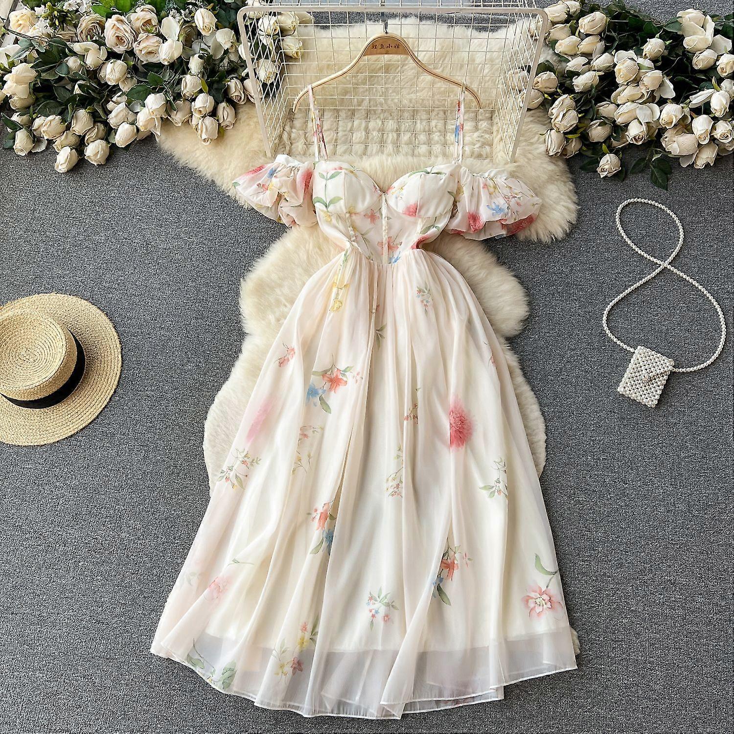 One-Shoulder Strapless Dress With A Soft Summer Vibe, Featuring A Cinched Waist, Floral Print, Bubble Sleeves, And Sheer Fabric For A Fairy-Like Look