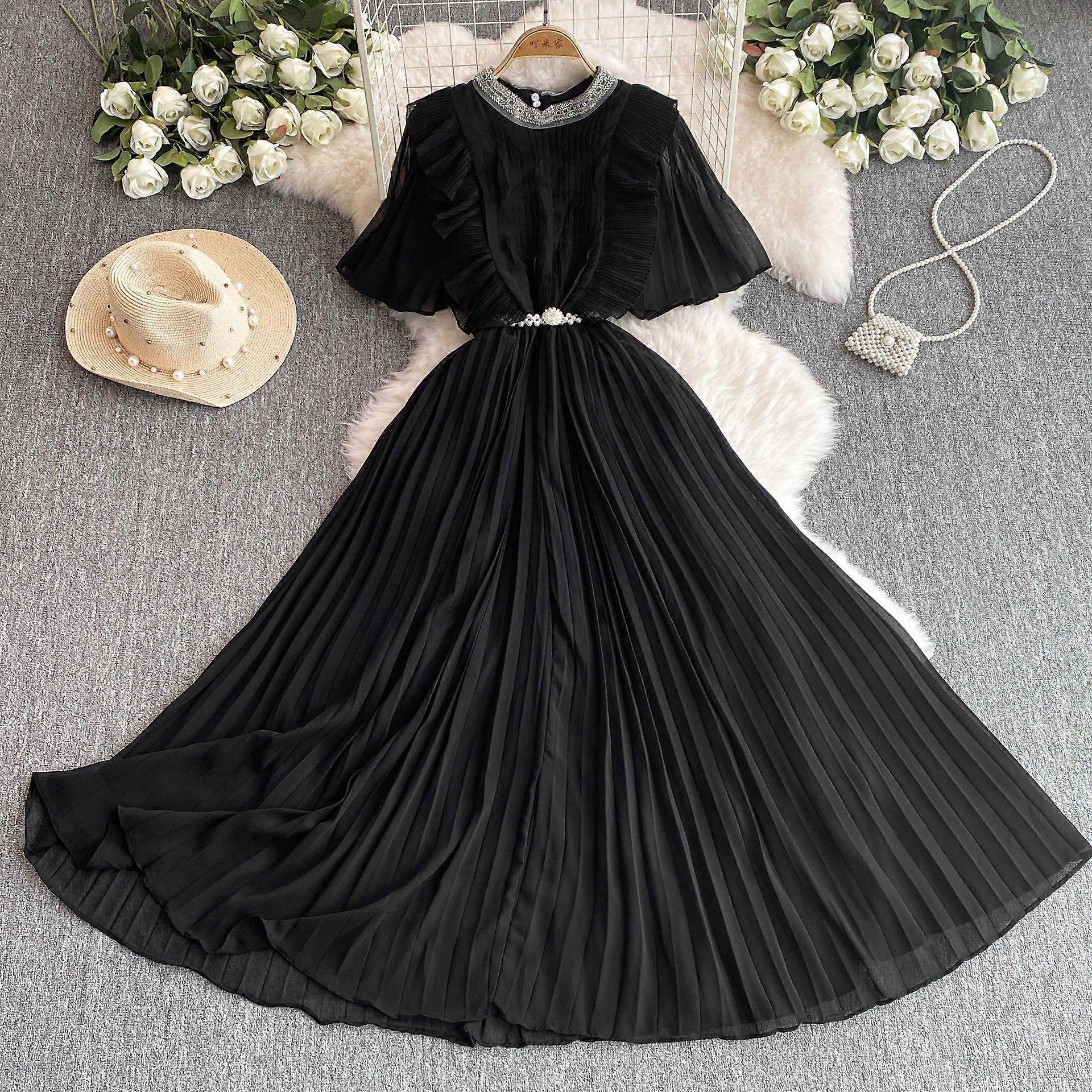 Summer Niche Light Luxury Retro Elegant Pleated Long Dress Tight Waist Slimming Elegant Trumpet Sleeve Dress
