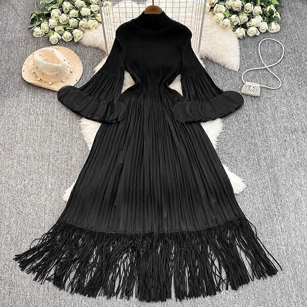 Large Dress Women's Winter Three-Dimensional Petal Trumpet Sleeve Elastic Tight Waist Elegant Long Tassel Dress
