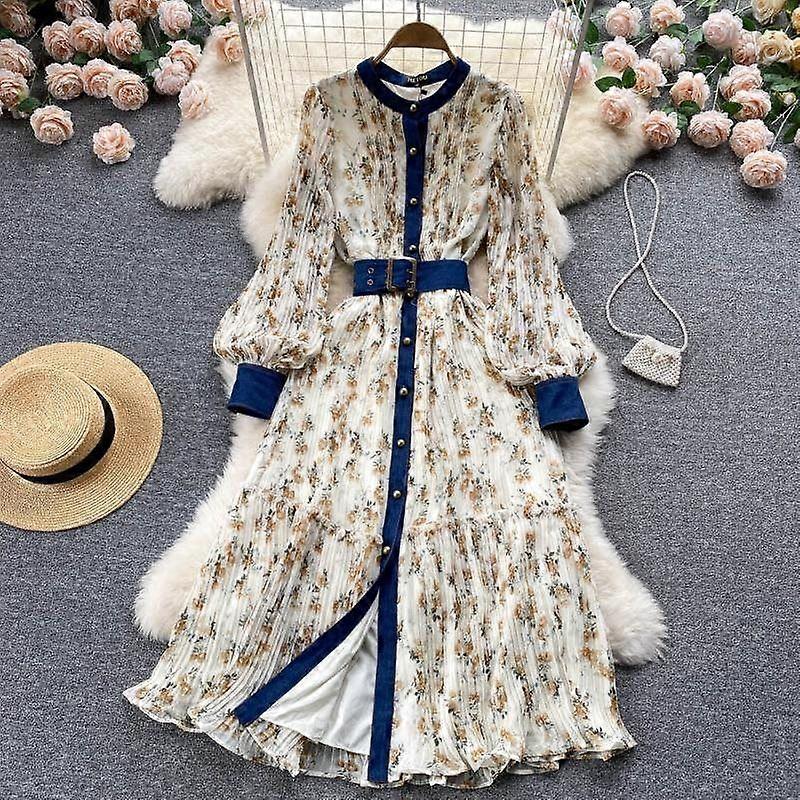 A Feminine Single-Breasted Lantern-Sleeved Round-Neck Floral Chiffon Dress, A Retro Over-The-Knee A-Line Long Skirt