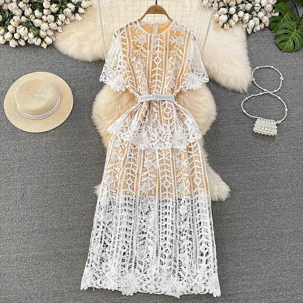 Vintage Court-Style Short-Sleeve Round-Neck Waistline A-Line Hook-Patterned Lace Dress With Openwork Lace-Elegant Long Dress