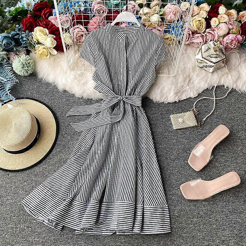 Vintage Red Stripe Light Mature Style Dress Short-Sleeved Women's Summer Small Waist Slimming Elegant Short Dress