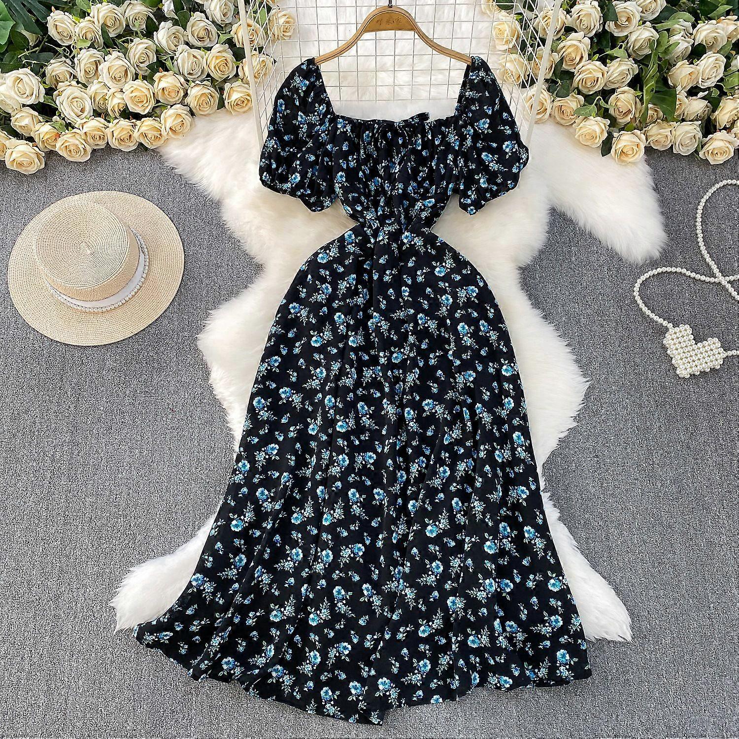 Elegant Lace-Up Floral Square Collar Puff Sleeve Dress Women's Summer Tight Waist Slim-Fit Long Dating Princess Dress