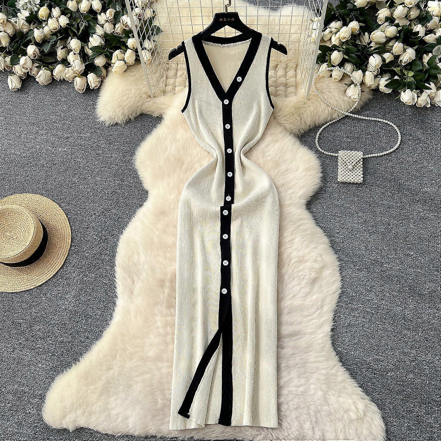 Summer Dress Female Celebrity Xiaoxiang Style Sleeveless Contrast Color Single-Breasted Tight Waist V-Neck Slim-Fit Knitted Dress