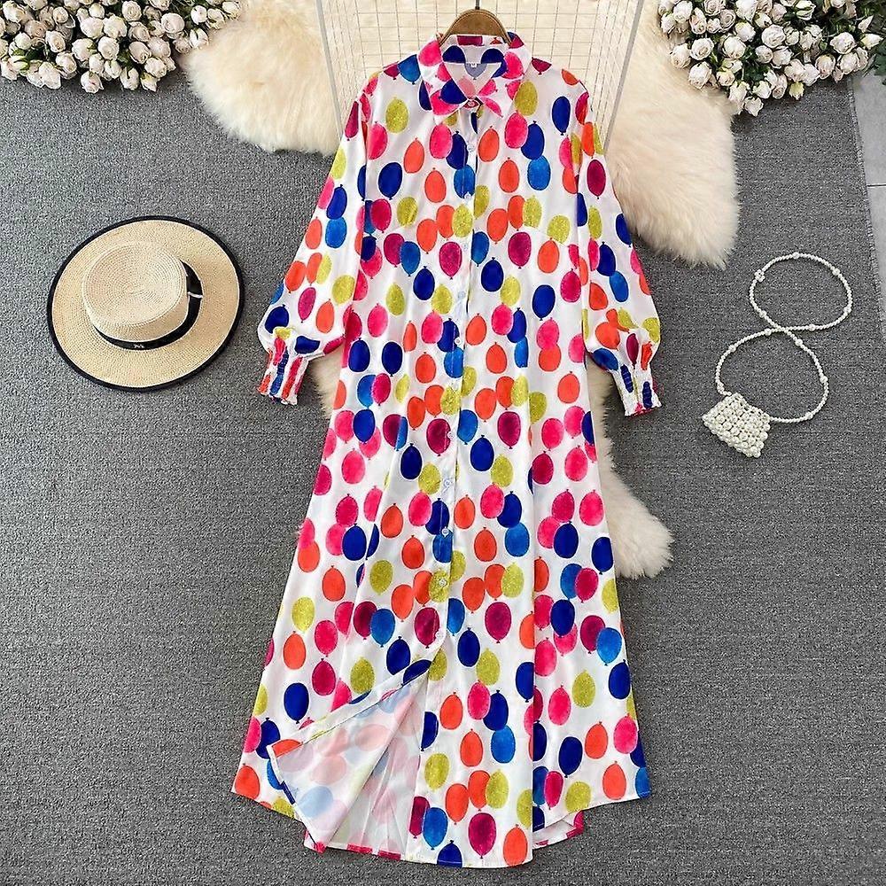 Fashionable Lantern Sleeve Long-Sleeved Printed Pogo Collar Shirt, Elegant Shirt Skirt, Long Dress, Women's Pattern