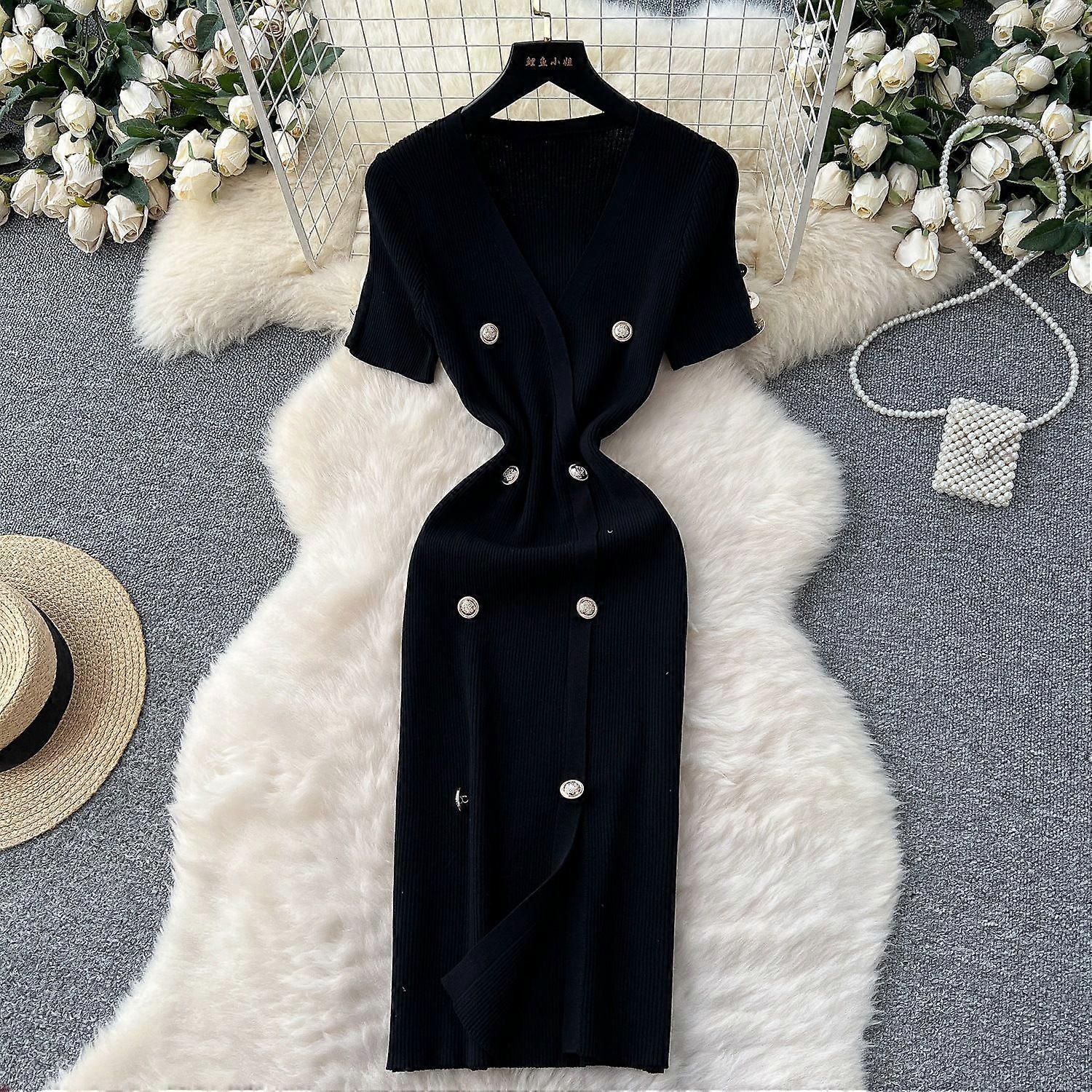 Celebrity Xiaoxiang Style High-End V-Neck Short-Sleeved Double-Breasted Slim-Fit Dress Women's Summer Tight Waist Hip-Wrap Knitted Dress