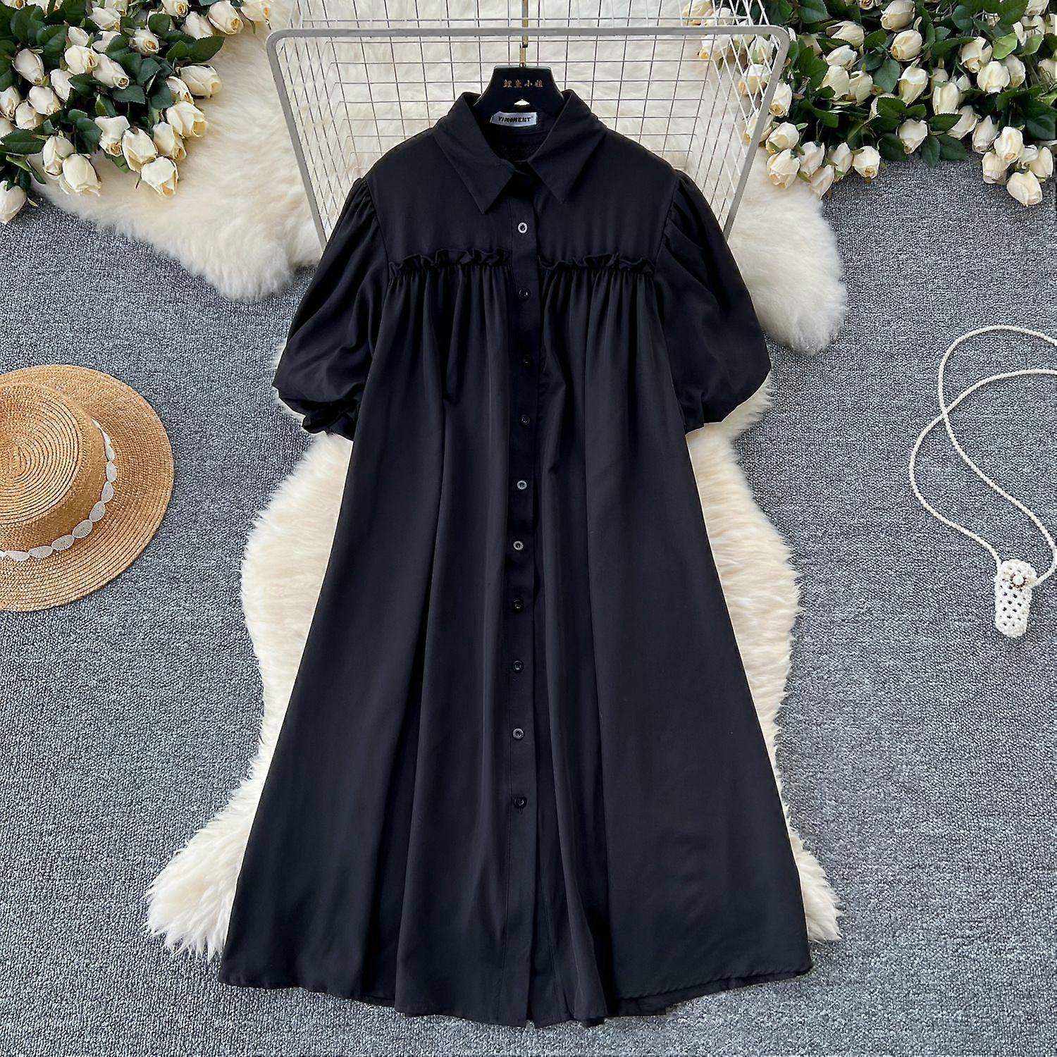 Lazy Style Dress Women's Korean Style Fashion Design Sense Lantern Sleeve Pleated Single-Breasted Slim-Fit Loose Shirt Dress