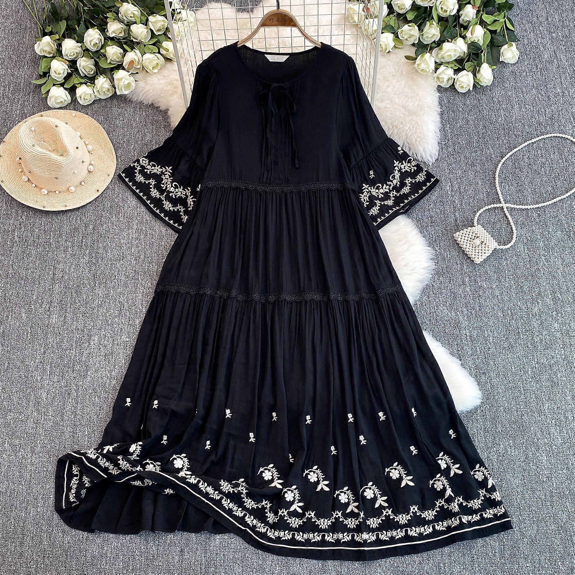 Loose Flesh-Covering Slimming Dress Women's Summer Ethnic Style Embroidered Seven-Sleeve Bohemian Dress 0515
