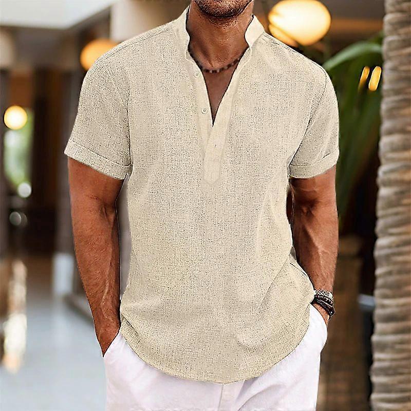 Casual Men's Summer Simple Solid-Color Short-Sleeved Shirt, Cyan Semi-Cardigan Stand-Up Collar Shirt