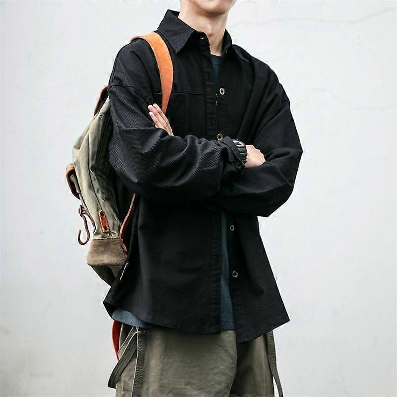 Japanese Retro Workwear Shirt, Men's Long-Sleeved Spring And Autumn Solid-Color Shirt, Pure Cotton Loose Lapel Top, Trendy Outerwear