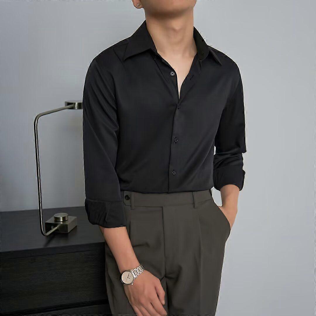 Autumn Black Shirt For Men, Long-Sleeved, Form-Fitting Korean-Style Business Formal Wear For Men, Wine Red Wedding Shirt, Elastic And Non-Ironing
