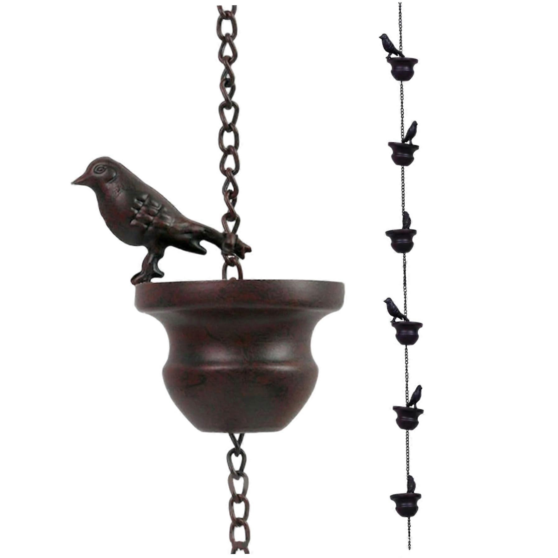 31.5 inches long rain chain with a decorative bird and cup design that diverts water and adds charm to your outdoor space. Material and build: handcrafted metal construction with a rustresistant finish for long lasting durability in all weather. Function and style: turns a downspout into a functional rain chain; hanging cups and birds create a soothing water flow. Outdoor decor: versatile for gardens, patios, or entrances; complements most exterior styles while providing practical drainage. Performance: designed for year round outdoor use; weather resistant and durable. Use scenarios: a standard downspout along a gutter line to direct rainwater while enhancing curb appeal. Install on a patio or near an entryway to create a focal point with the sound and sight of running water. Use in a garden or courtyard to guide runoff into a planter bed or ground area, offering an eco friendly drainage solution.