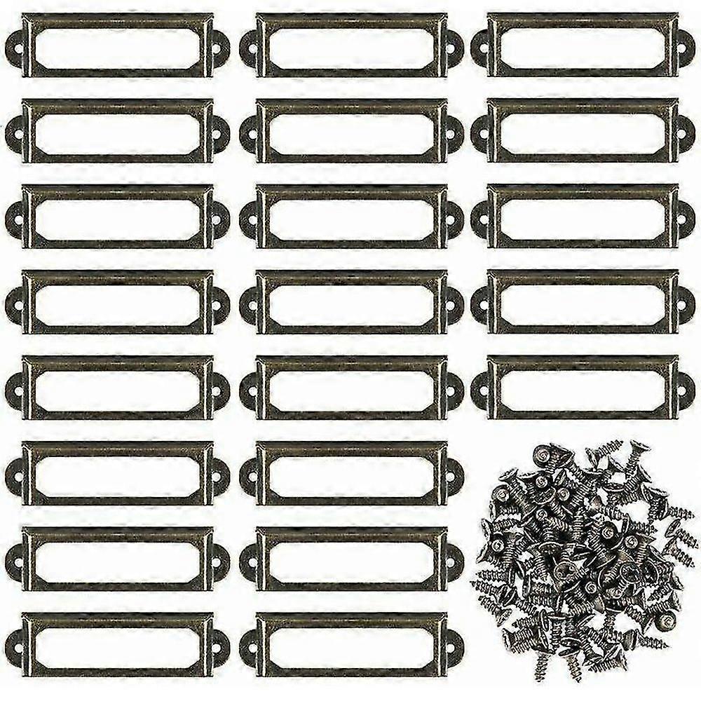 This set of 50 antique bronze metal label holders is perfect for organization and identification. The durable, slotted design with a hanging handle is ideal for holding business cards, tags, or small labels. Easily install them on wooden surfaces using the included screws. Great for use in cabinets, drawers, shelves, cubicles, closets, wine cellars, libraries, jewelry boxes, and storage containers to neatly label and categorize items.