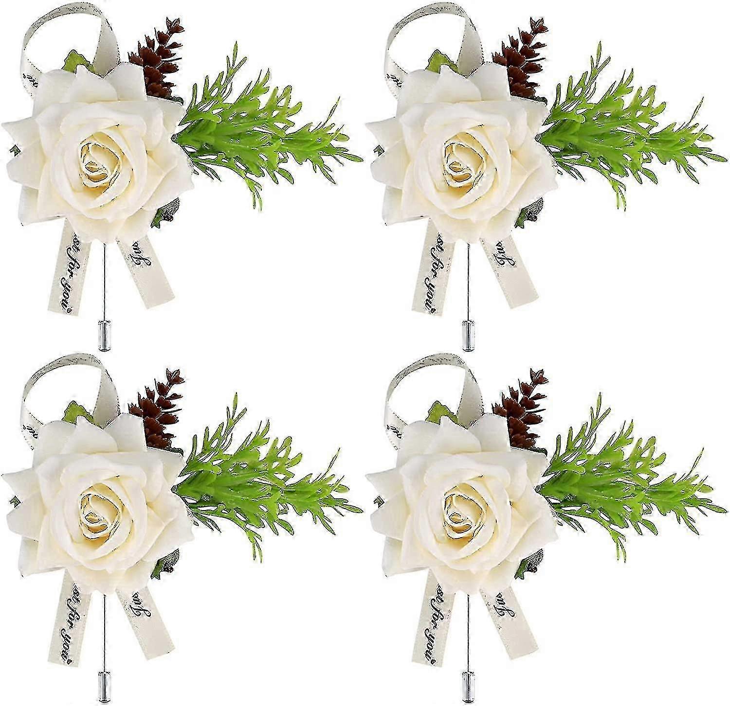 25-26 4 Pcs Wedding Boutonnieres, White Rose Corsage Buttonhole Flowers With Pin Clip