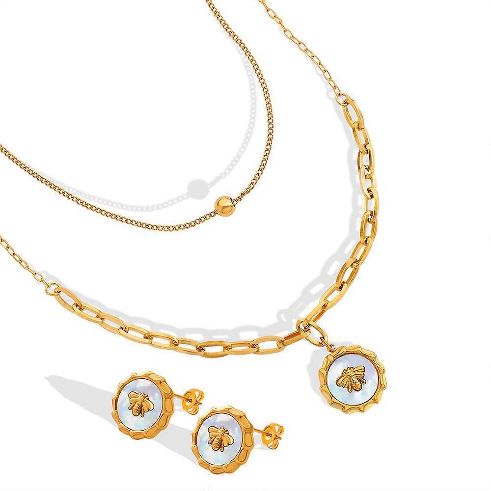 Jewelry Set, Pastoral Style Fashionable Versatile White Sea Shell Bee Plate Double Layer Necklace Earrings