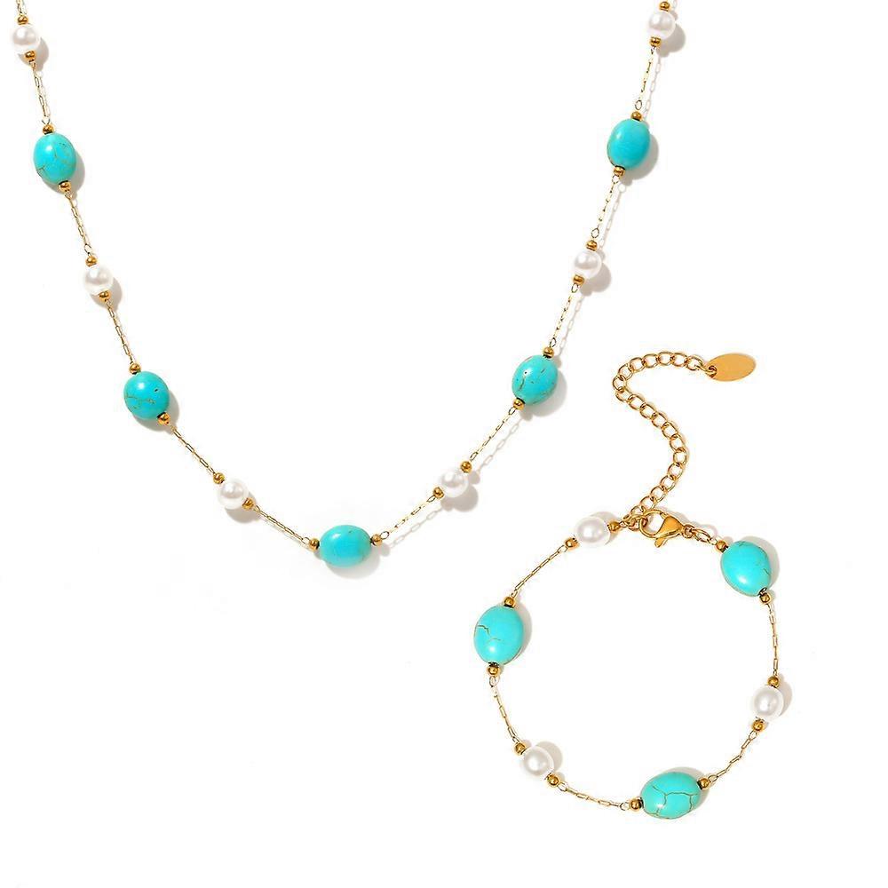 Necklace and Bracelet Set, Ins Style Natural Blue Turquoise Imitation Pearl Stainless Steel Elegant Jewelry