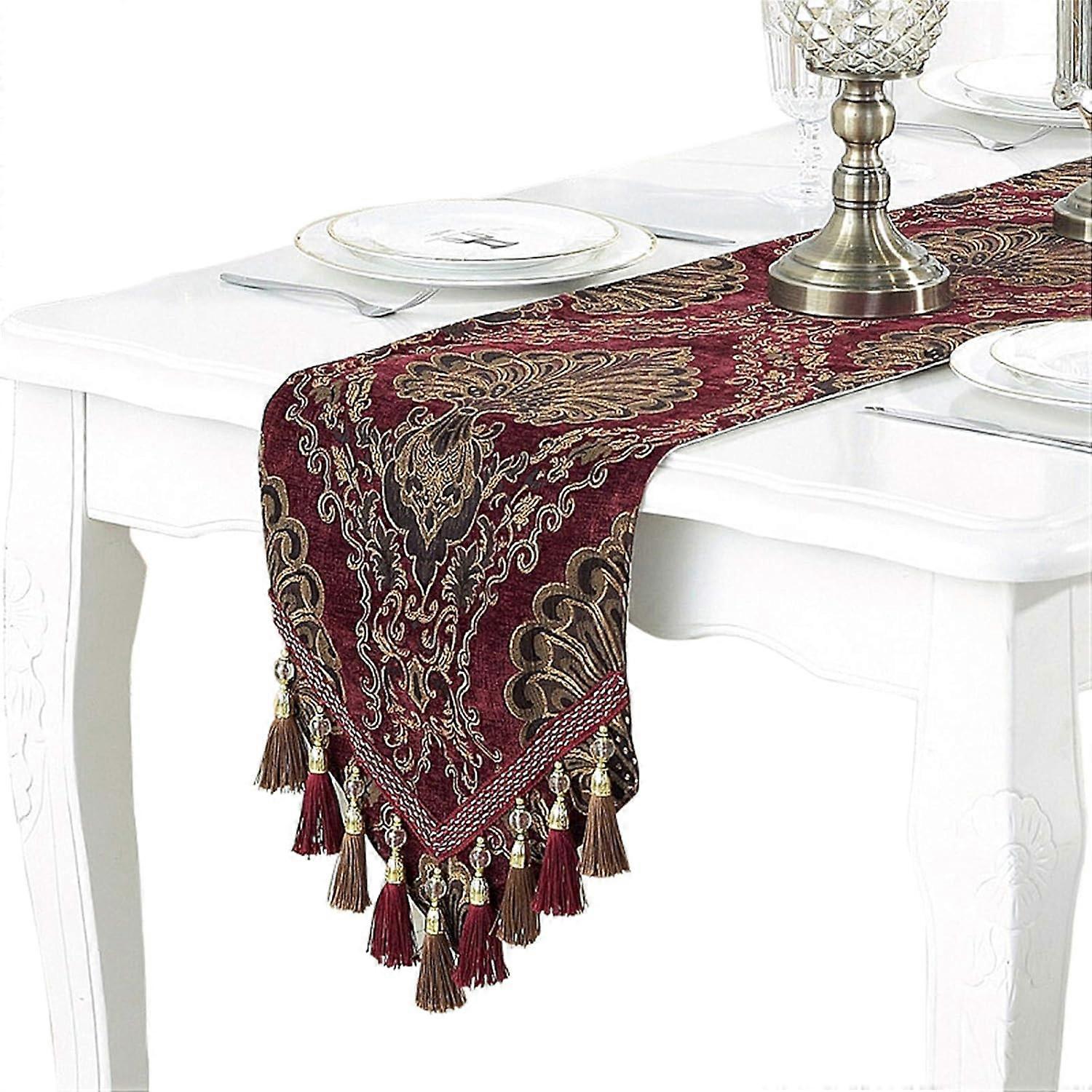 Embroidery Luxury Table Runner Jacquard Fabric Table Runner with Multi-Tassels for Dining Room Dresser Wedding Party Decorations, 13" x 82", Red Red 1