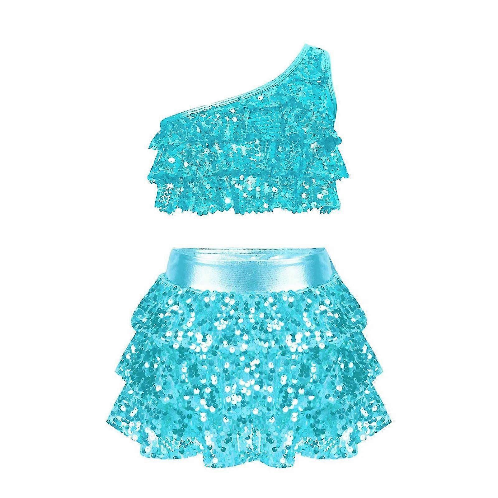 Kids Girls Jazz Dance Outfit Two Pieces Shiny Sequins Tiered Ruffles Metallic Crop Top with Skirted Shorts Childs Party Costumes 25-26