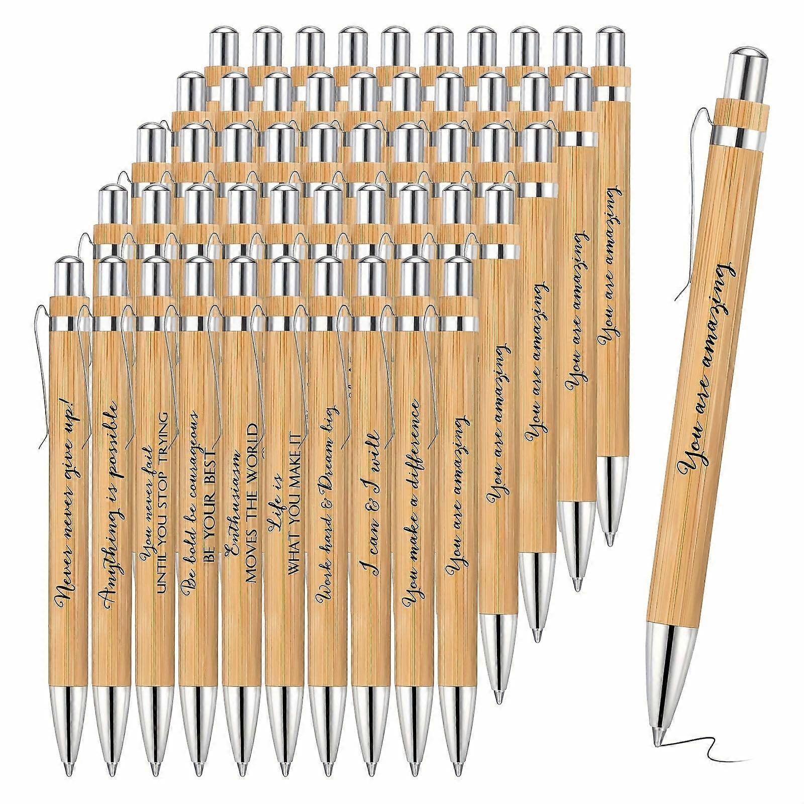 50pcs Inspirational Quote Bamboo Pens - Motivational Wooden Retractable Ballpoint Pens with Black Ink, Lightweight Medium Tip for Office, Classroom, a