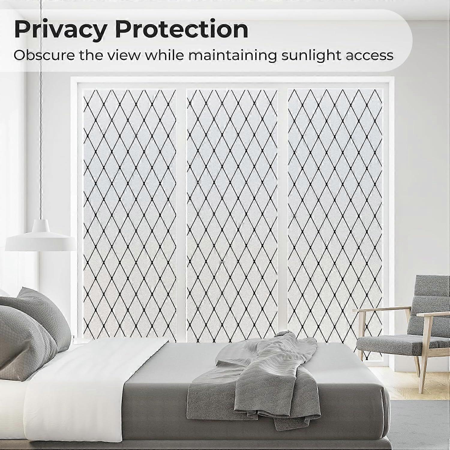Frosted solar control window film, UV-resistant, static cling, for optimal privacy. Removable decorative vinyl sticker, black trellis pattern, 44.5 cm