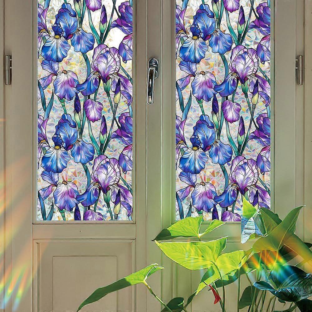 43x100cm Privacy Window Film - 3D Static Cling Vinyl Sticker for Stained Glass - Iris Flower Pattern - Non-Adhesive