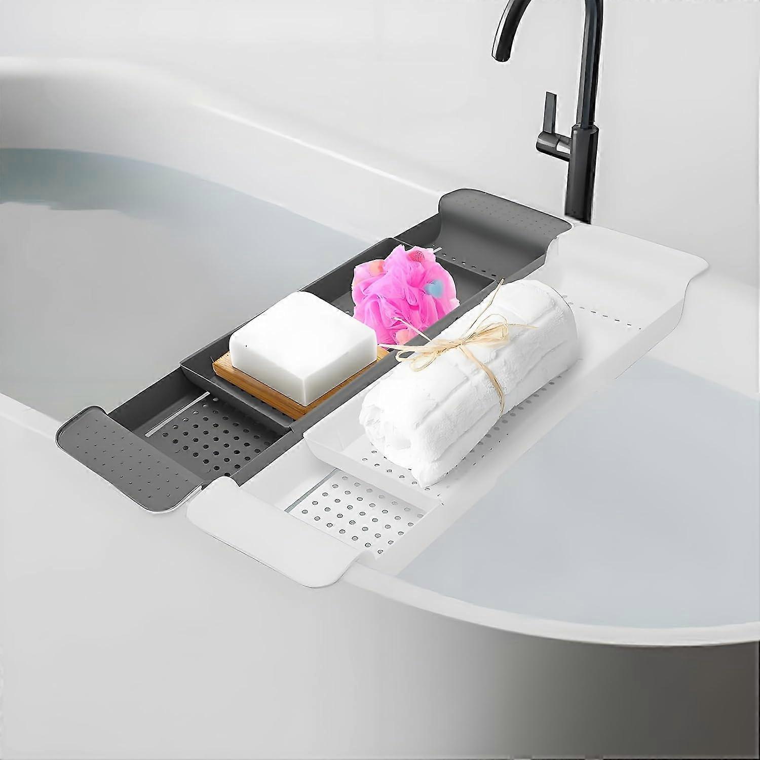 Adjustable Bathtub Caddy Tray Retractable Bath Rack Shelf with Drain Holes Expandable Bathtub Organizer Holder for Wine Glass Book Tablet Phone Candle