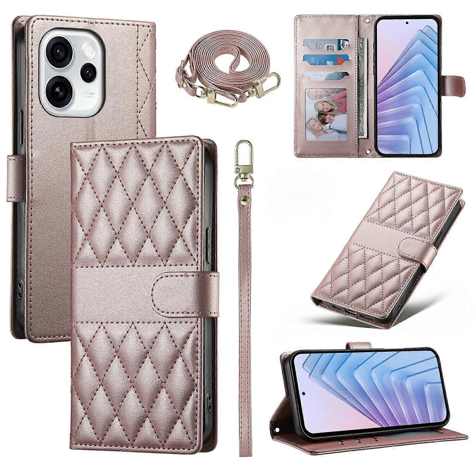 For Oppo Reno15 Pro 5G Wallet Case Rhombus Stitching Stand Leather Phone Cover with Long Short Strap