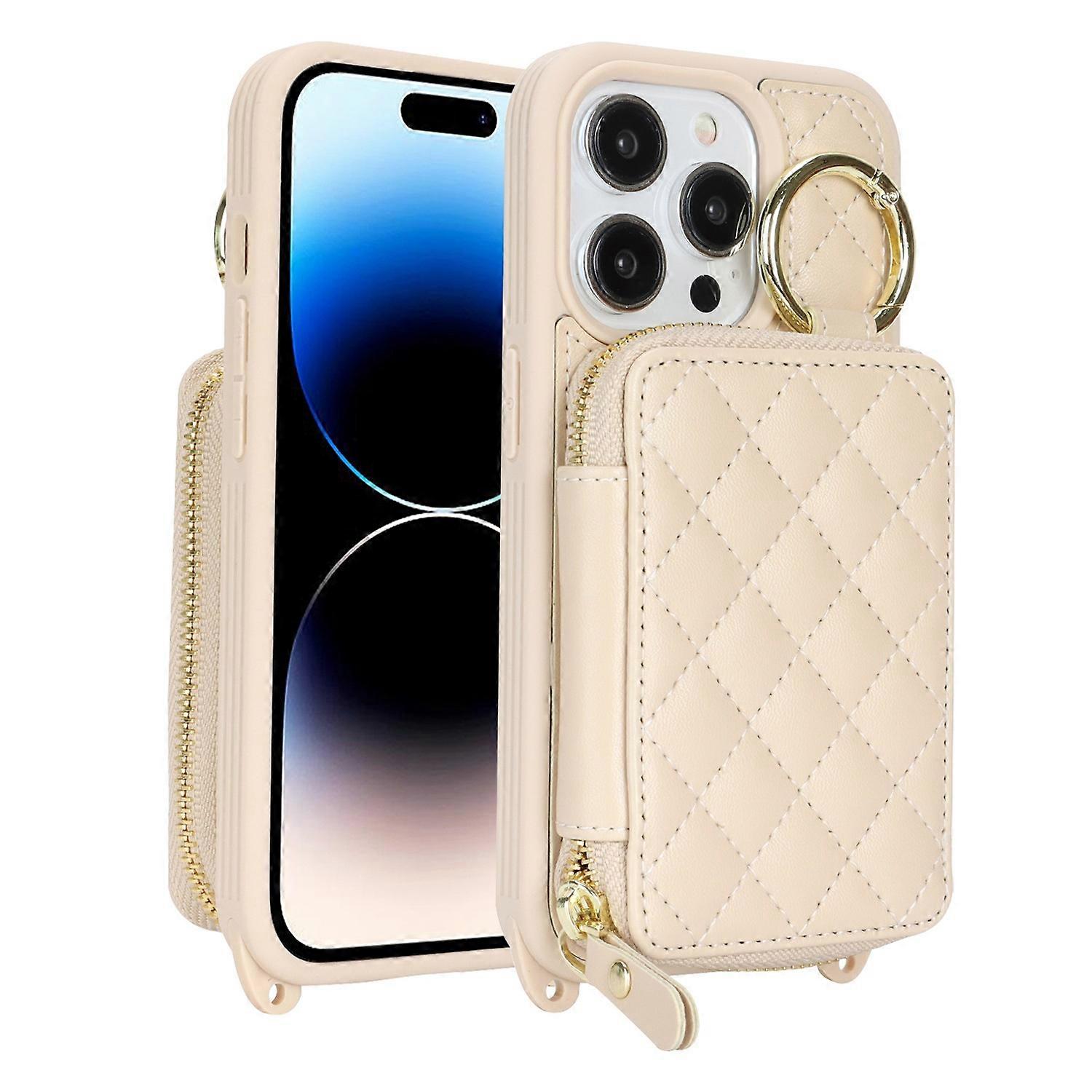 For iPhone 14 Pro Case Ring Holder Zipper Pocket Kickstand Leather Back Phone Cover with Shoulder St