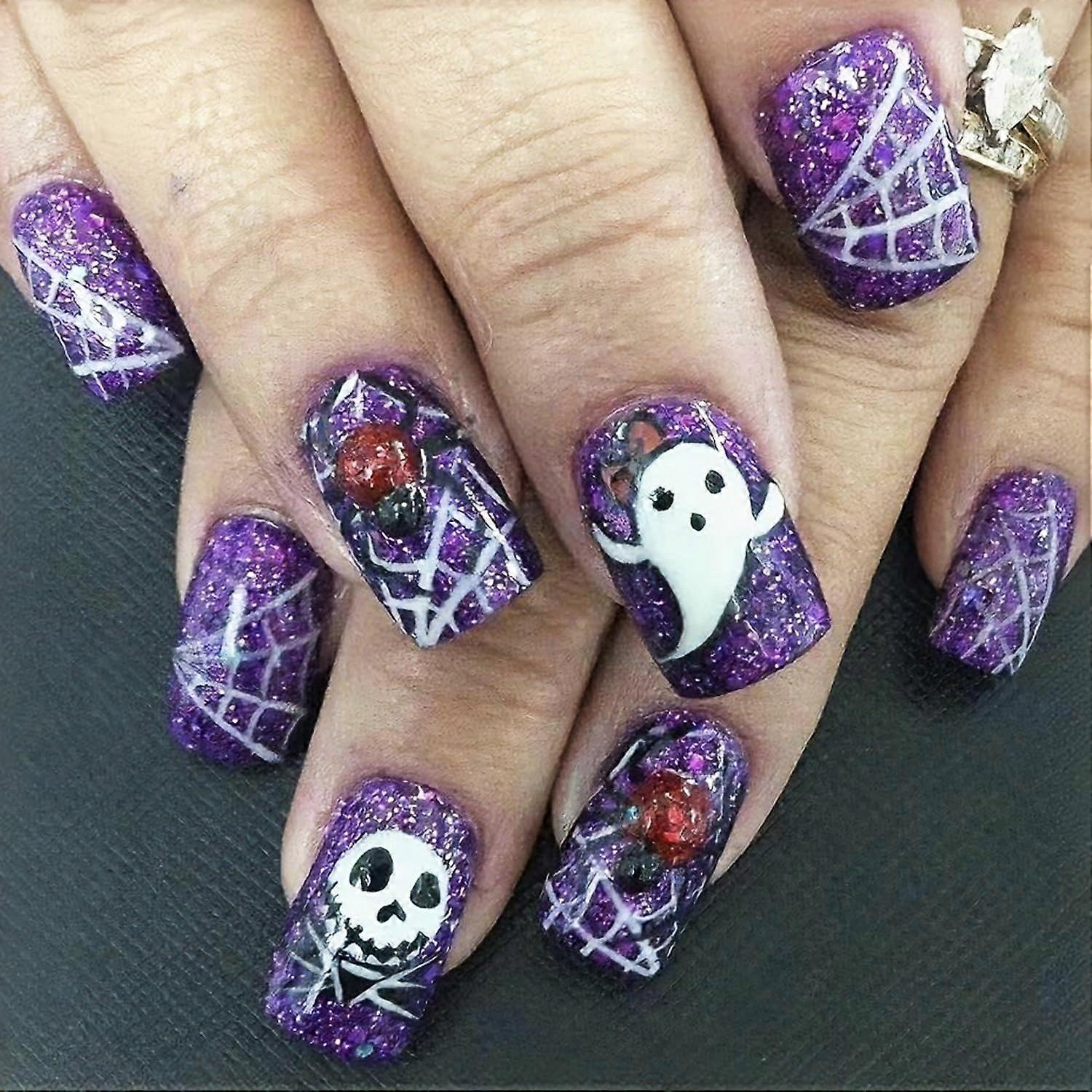 Halloween Purple Glitter Press On Nails with Spider Web Design Short Acrylic Fake Nails for Women