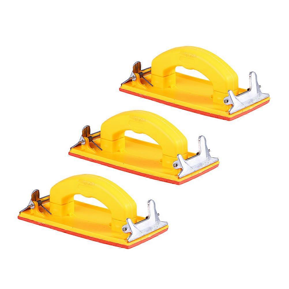 of PP material, the sandpaper holder can clamp sandpaper on the surface firmly. Easy to install clamp sandpaper by the clip. Featuring lightweight and compact size, comfortable hand grip, you can take this sandpaper holder to any place. Feature - Color: Yellow. - Material: PP. - Size: About 18.00X8.50X6.50cm/7.07X3.34X2.55in. - Note: The bottom pad's color is random. - Great for hand sanding contoured or flat surfaces, wall, plasterboard, drywall, wood, metal, etc. - A great polishing grinding tool for daily use. Suitable for woodworking use. - Made of PP, with two sturdy clamps on both sides, can replace sandpaper and clamp firmly. - The handle is comfortable to hold, non-skid and wear-resistant, not to wear hands, improve work efficiency. - Sandpaper is fixed by clips on both sides of holder, faster and easier to change different sandpaper, very easy to operate. Package list: 3 x Sandpaper Holders